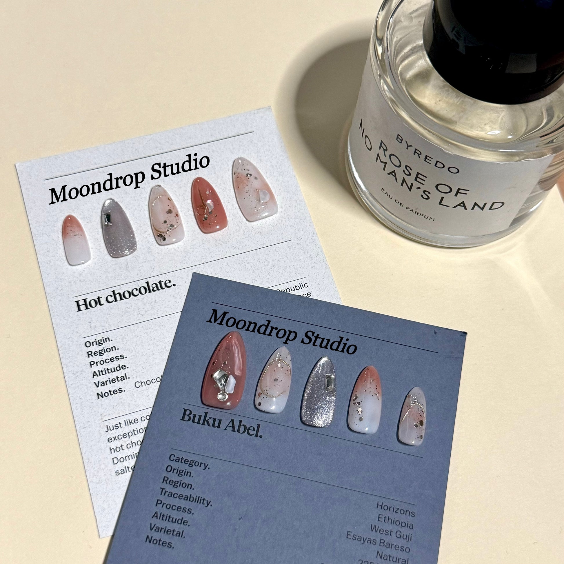 Features soft pink, nude, and translucent white tones. Embellished with fine silver foil, small embedded metallic accents, and a subtle shimmer. Has a delicate, cozy aesthetic, reminiscent of a warm, comforting drink. A mix of deep mauve, soft white, and shimmering silver shades. Includes gold and silver foil, small crystal-like embellishments, and a glossy metallic accent nail. The design balances sophistication and minimalism with a touch of glamour.