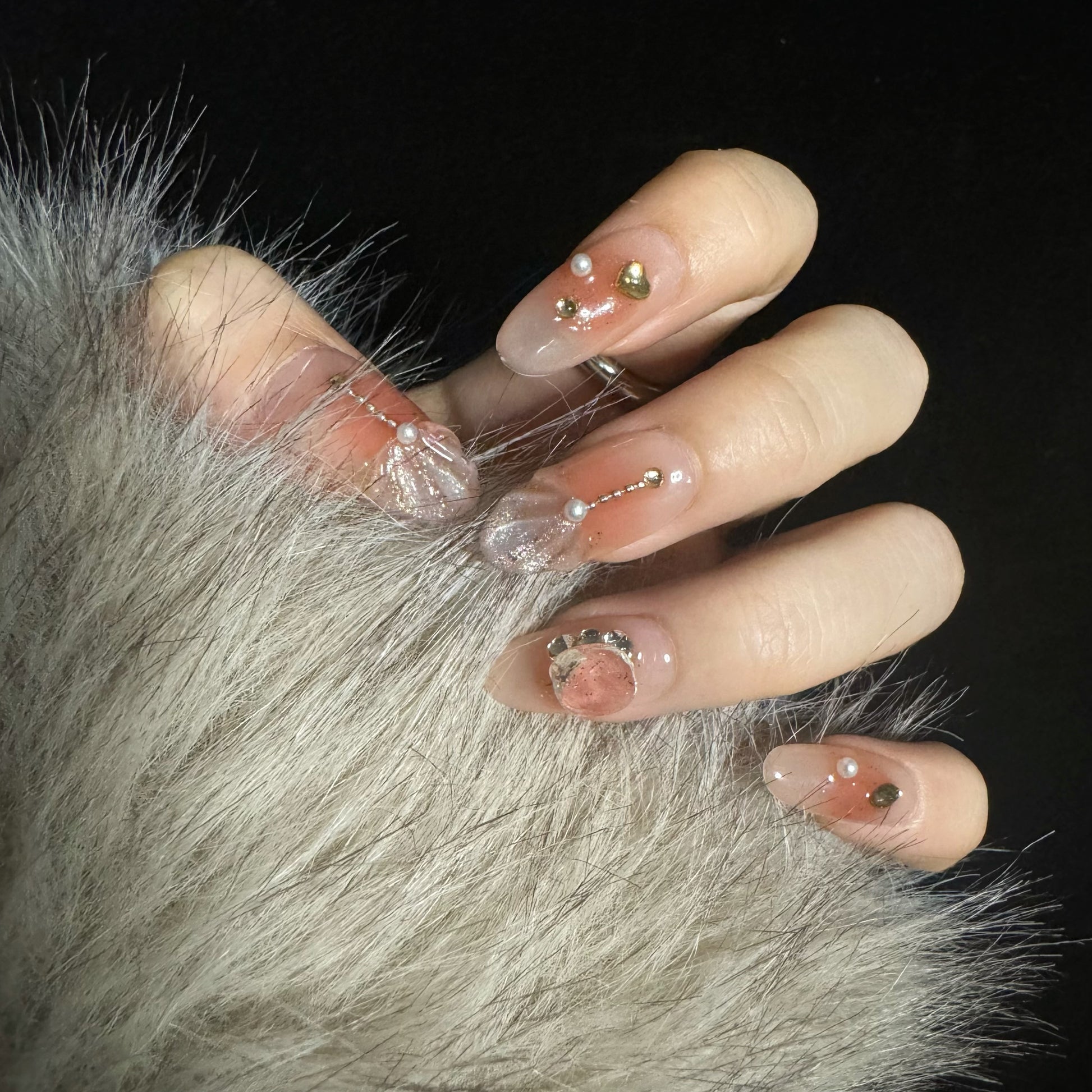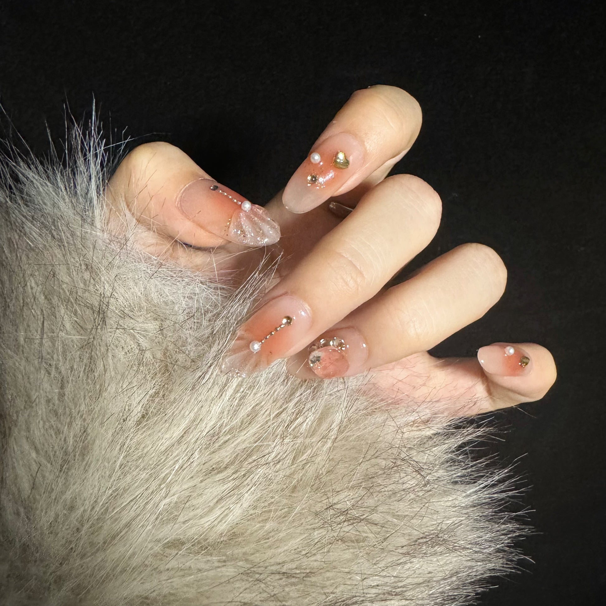 This set has a soft nude-pink base with a gradient of subtle shimmer at the tips, giving it a glowy, almost frosty look. The nails are decorated with small, delicate rhinestones and gem accents, adding a touch of elegance. This set features a nude-beige base with a matte finish. The nails have subtle sparkly tips, and several nails are adorned with small rhinestones, including one with a larger, round gem placed at the center, giving it a refined and minimalistic aesthetic.