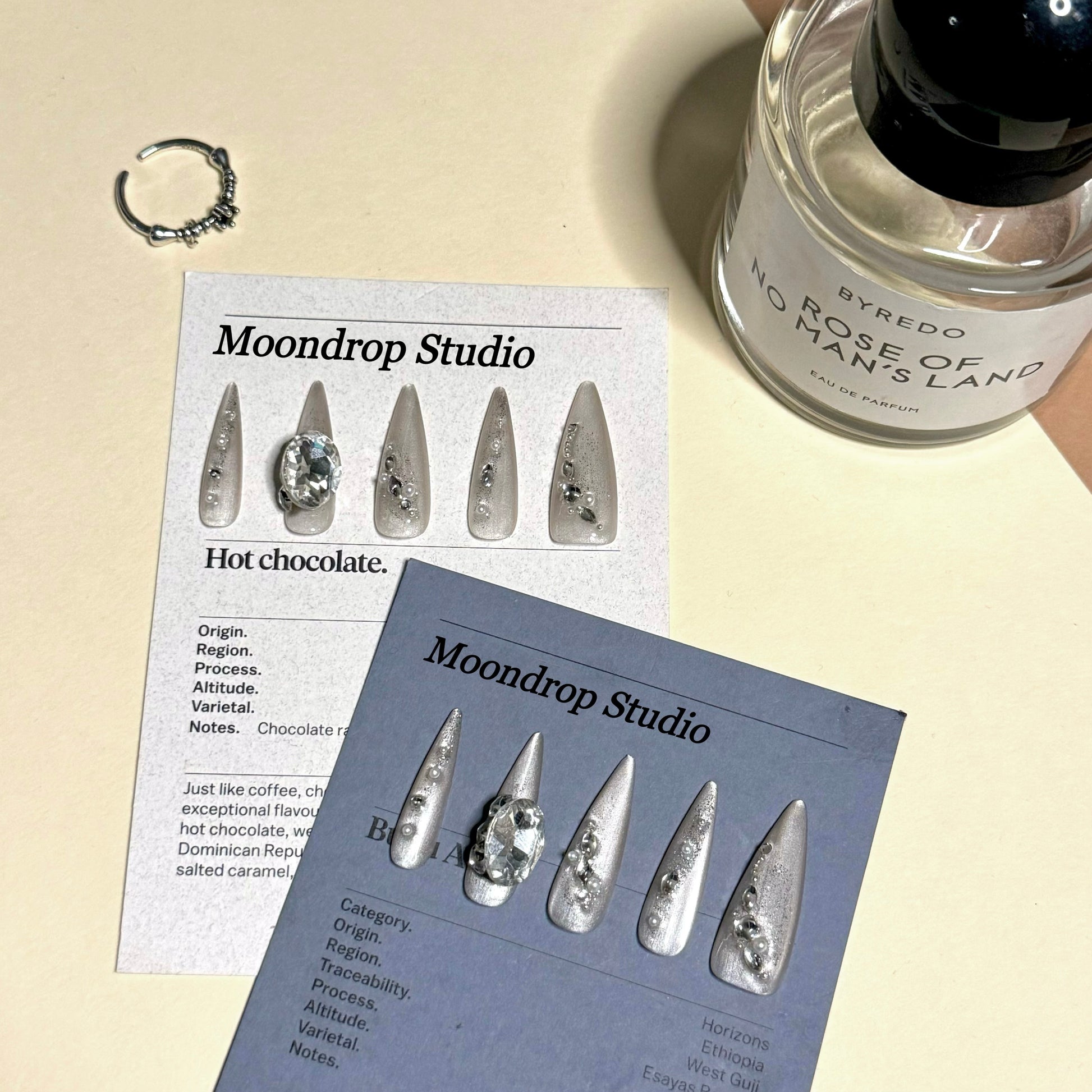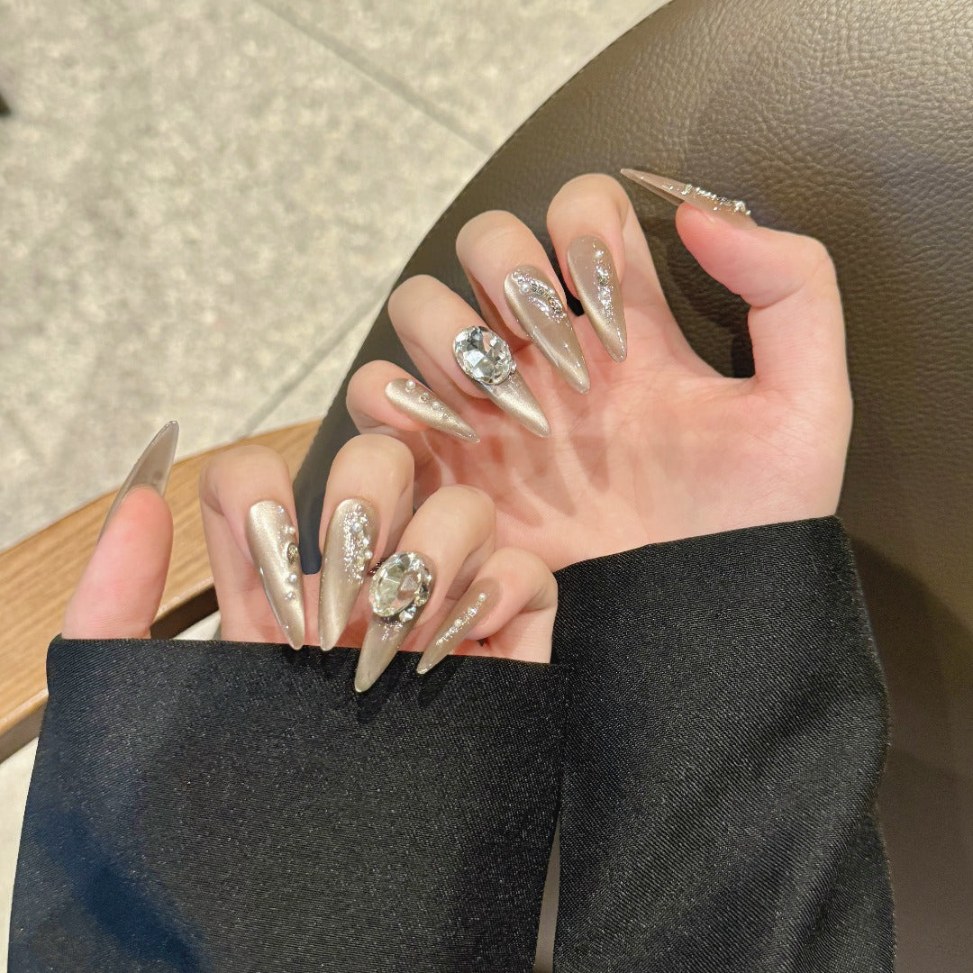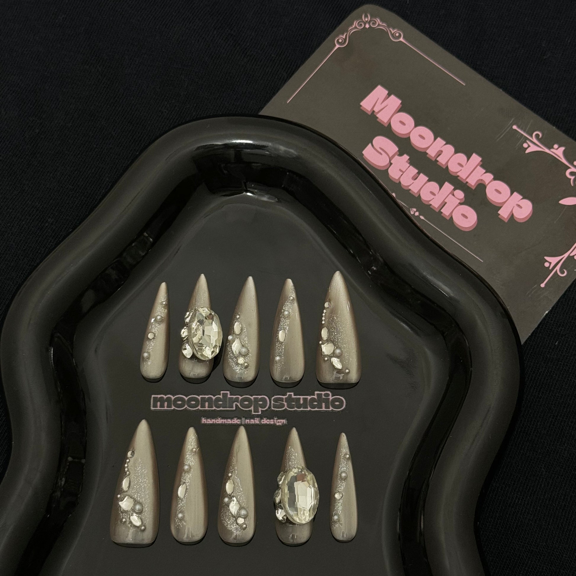 The nails in the image have an elegant and luxurious design. They are long, pointed stiletto-shaped press-on nails in a muted, taupe or champagne-toned base color with a soft shimmer. The design is embellished with a mix of small and large crystal-like rhinestones and pearl-like accents, creating a sophisticated, gem-studded effect.Two of the nails feature large statement crystals, adding a bold, glamorous touch. The overall aesthetic is sleek, refined, and high-fashion, perfect for an elegant or formal occasion.