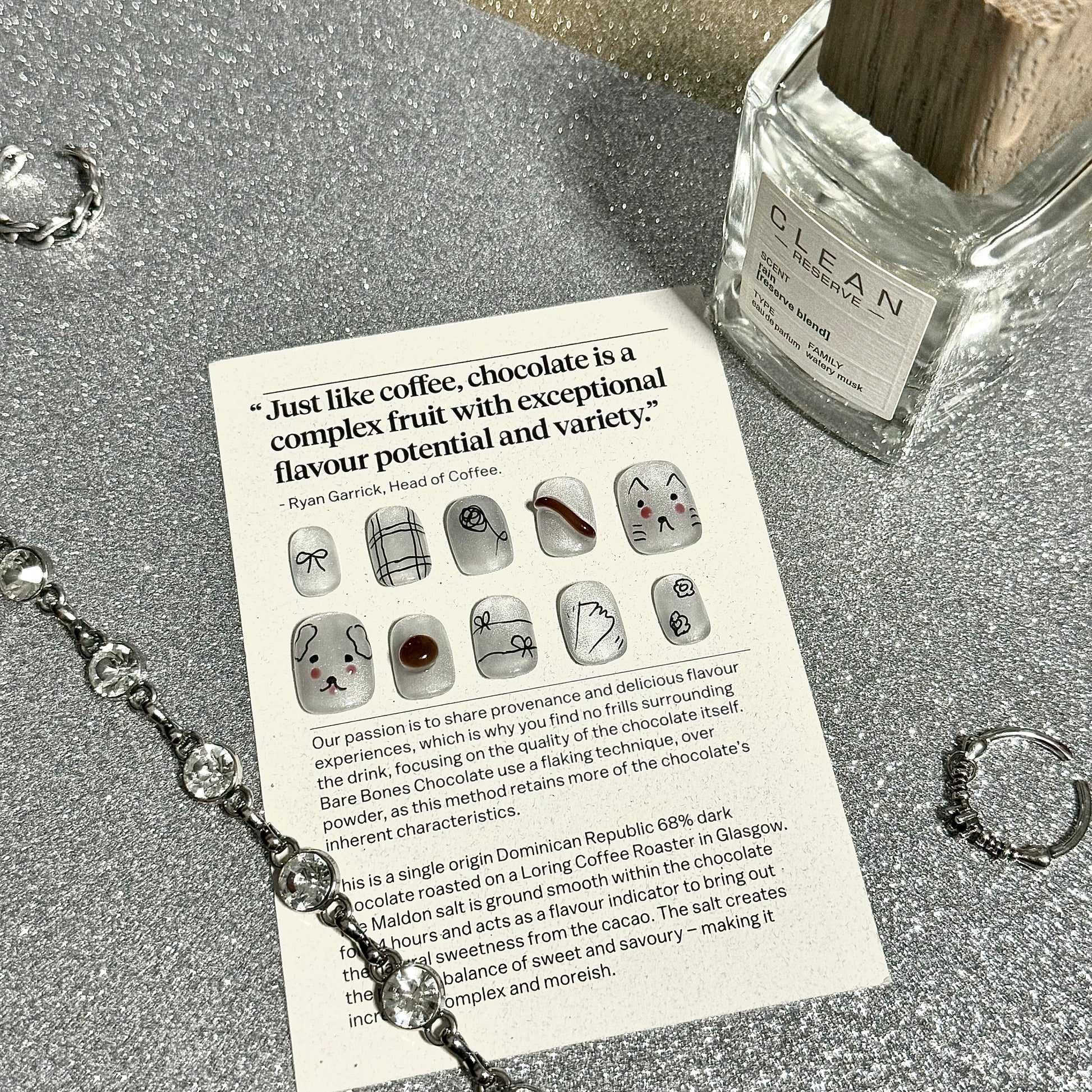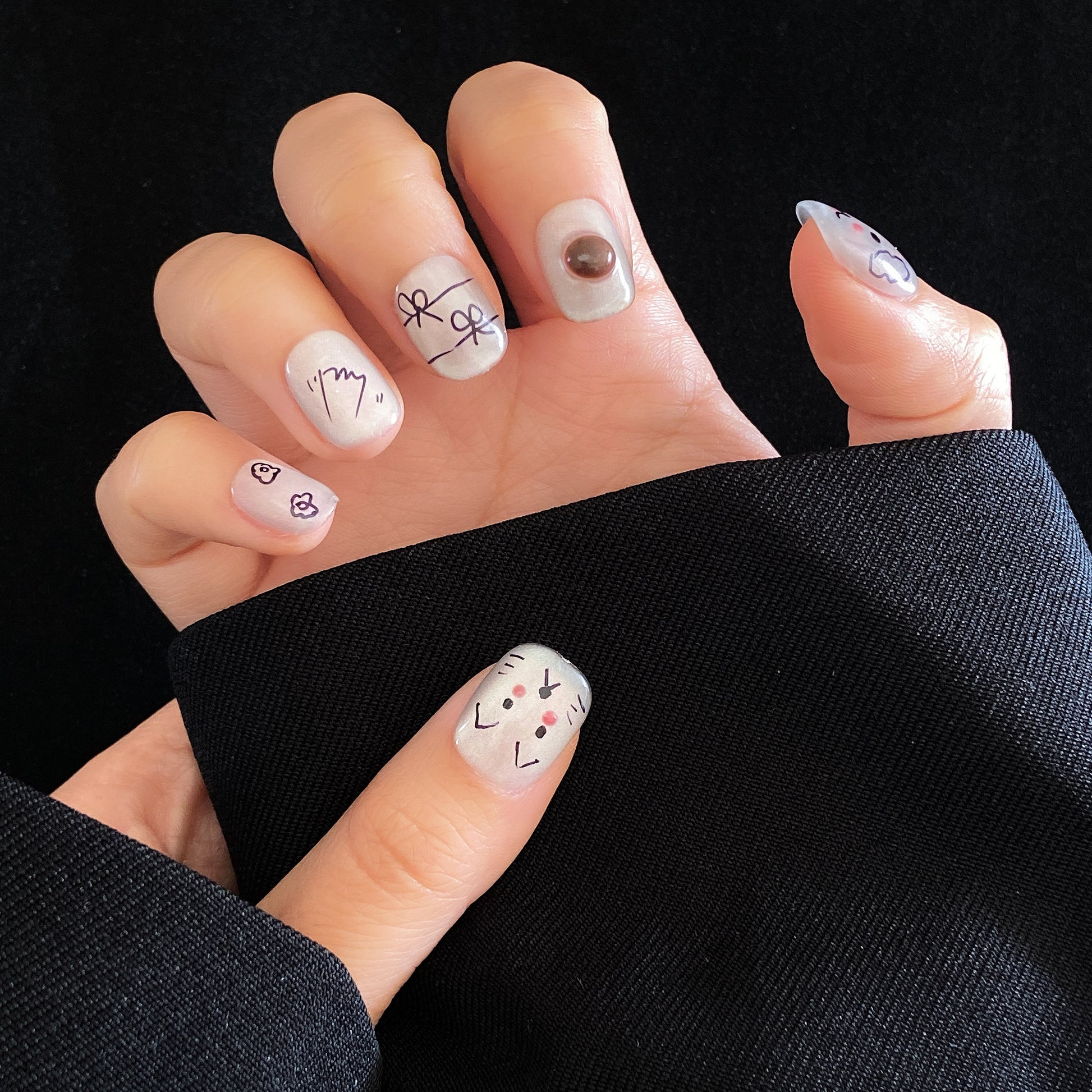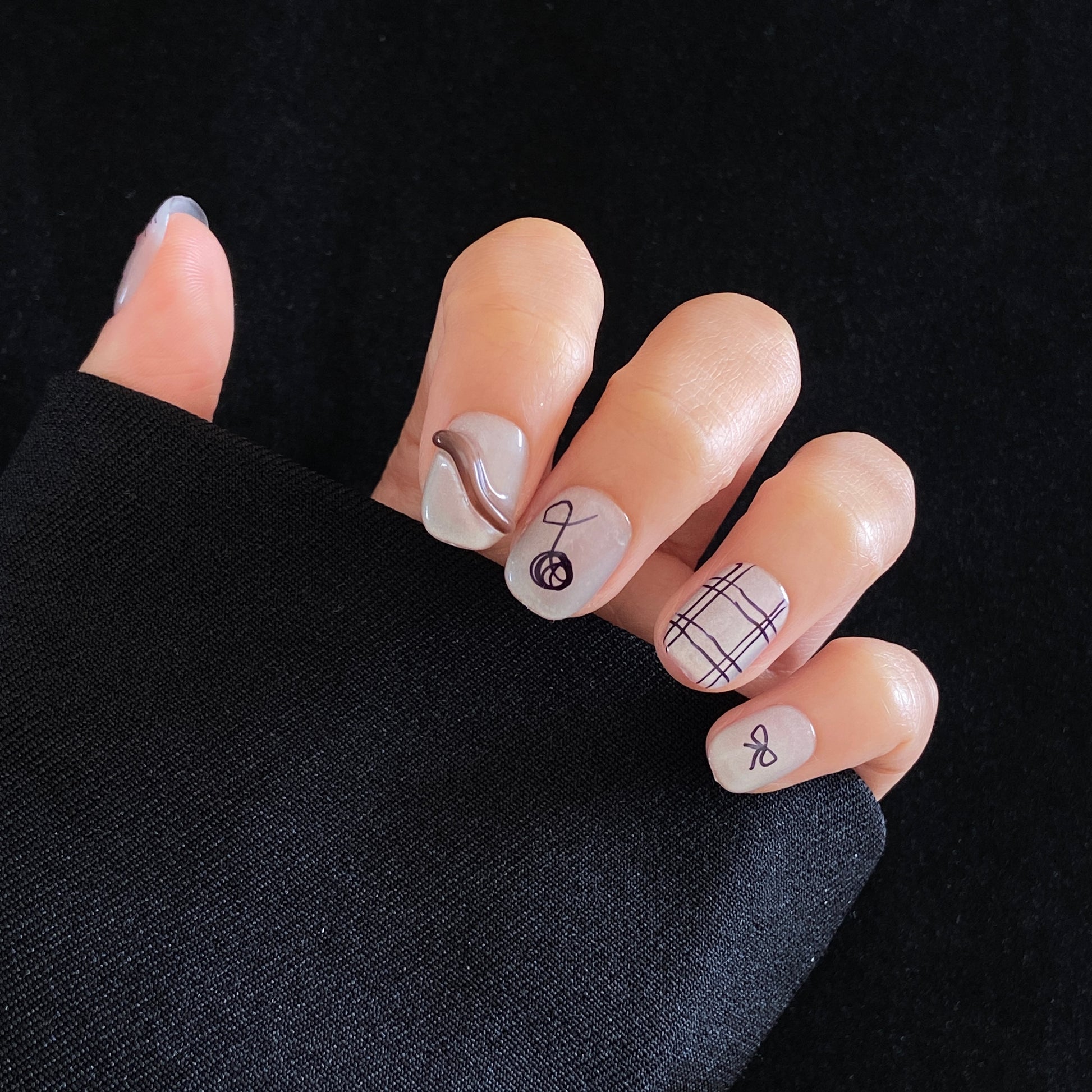 The first nail features a cute bear face with rosy cheeks.The second one has a simple plaid pattern.The third design shows a brown drip or line, resembling a melted substance.The fourth nail depicts a cute cat face with small details like blush and whiskers.The fifth nail has a rose illustration with thin lines and a soft floral aesthetic.