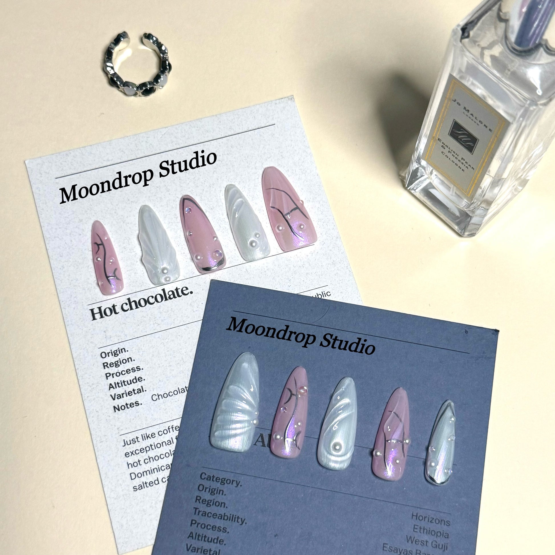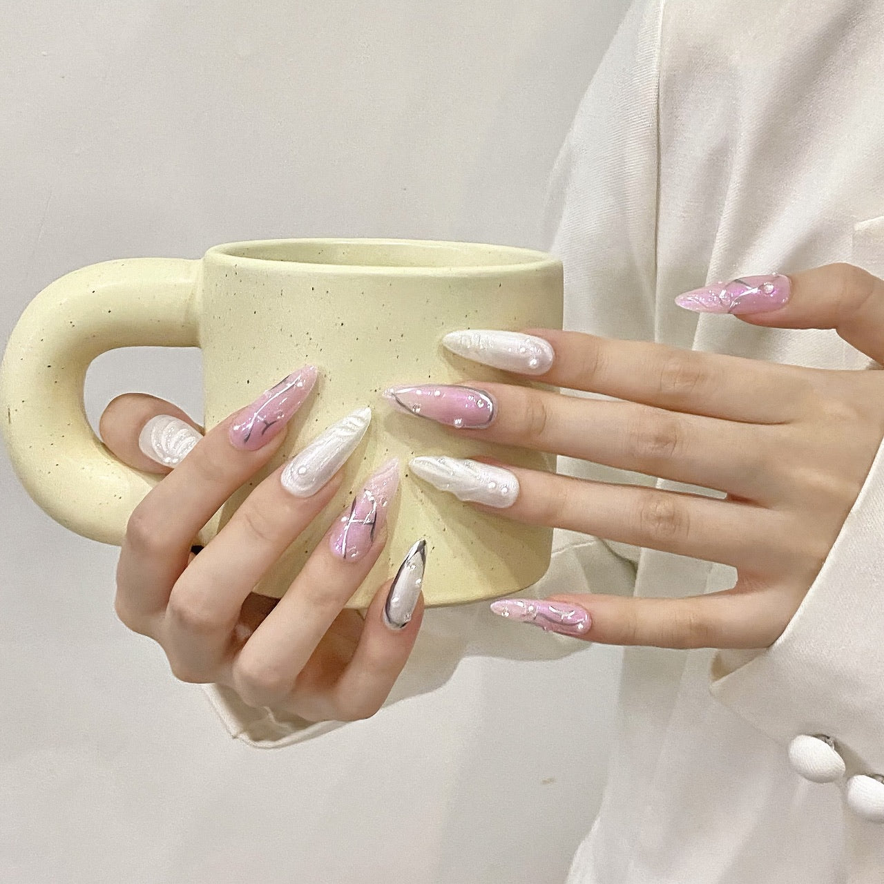 The image shows two sets of artificial nails presented on cards with a minimalistic design.This set features a combination of pink and white nails with delicate, fine lines and subtle details, such as small pearls or gems.And also displays a different design with iridescent, pearl-like white and pink nails that have swirled, marble-like patterns and thin metallic accents. Both sets seem to have a sophisticated, trendy aesthetic with soft pastel tones and elegant decorations.