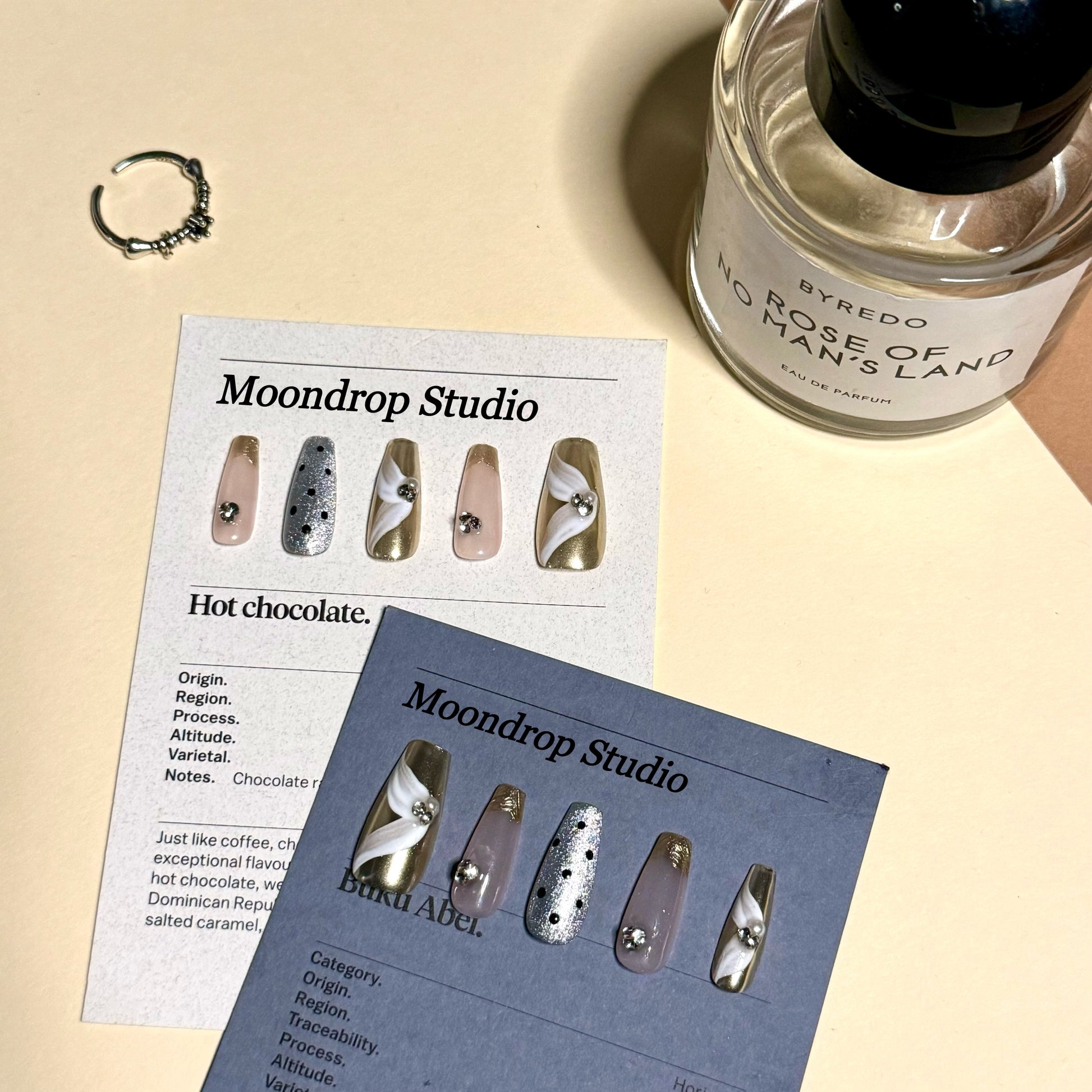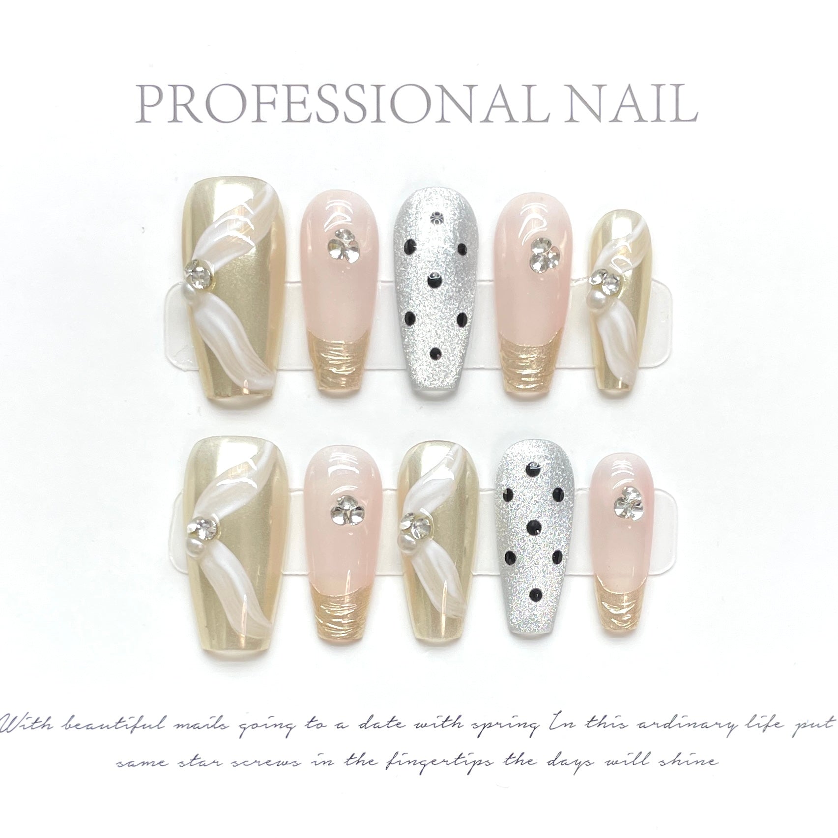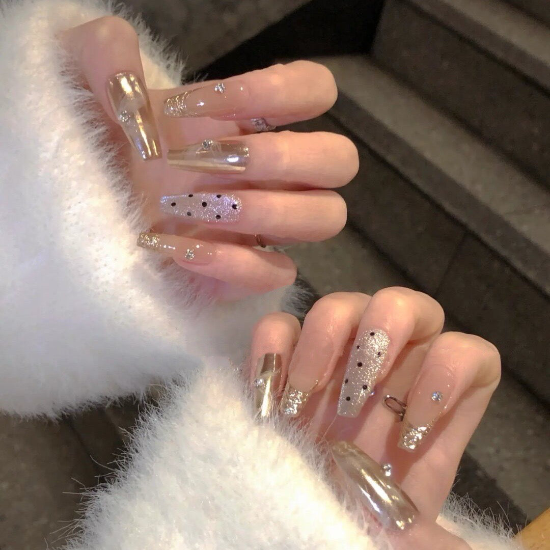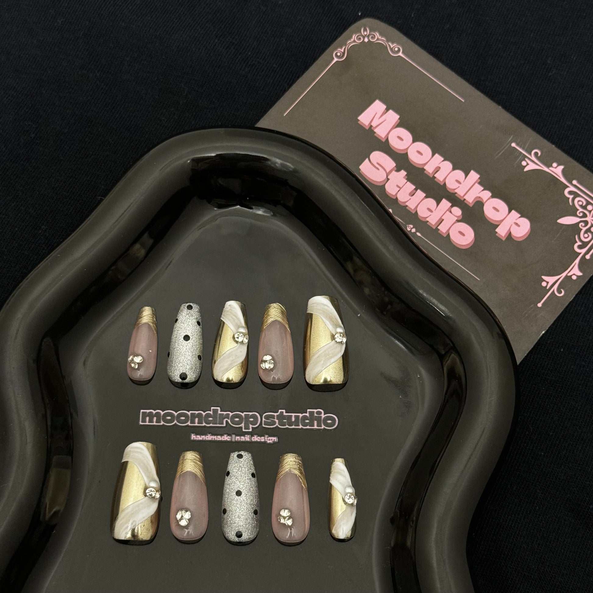 Soft, muted mauve nails are decorated with small rhinestones and gold wire-like accents for a chic, sophisticated look. Some nails feature metallic gold polish with a textured, crisscross pattern, paired with a white, swirled design resembling marble. A couple of nails are covered in fine silver glitter with black polka dots, adding a playful and glamorous touch.