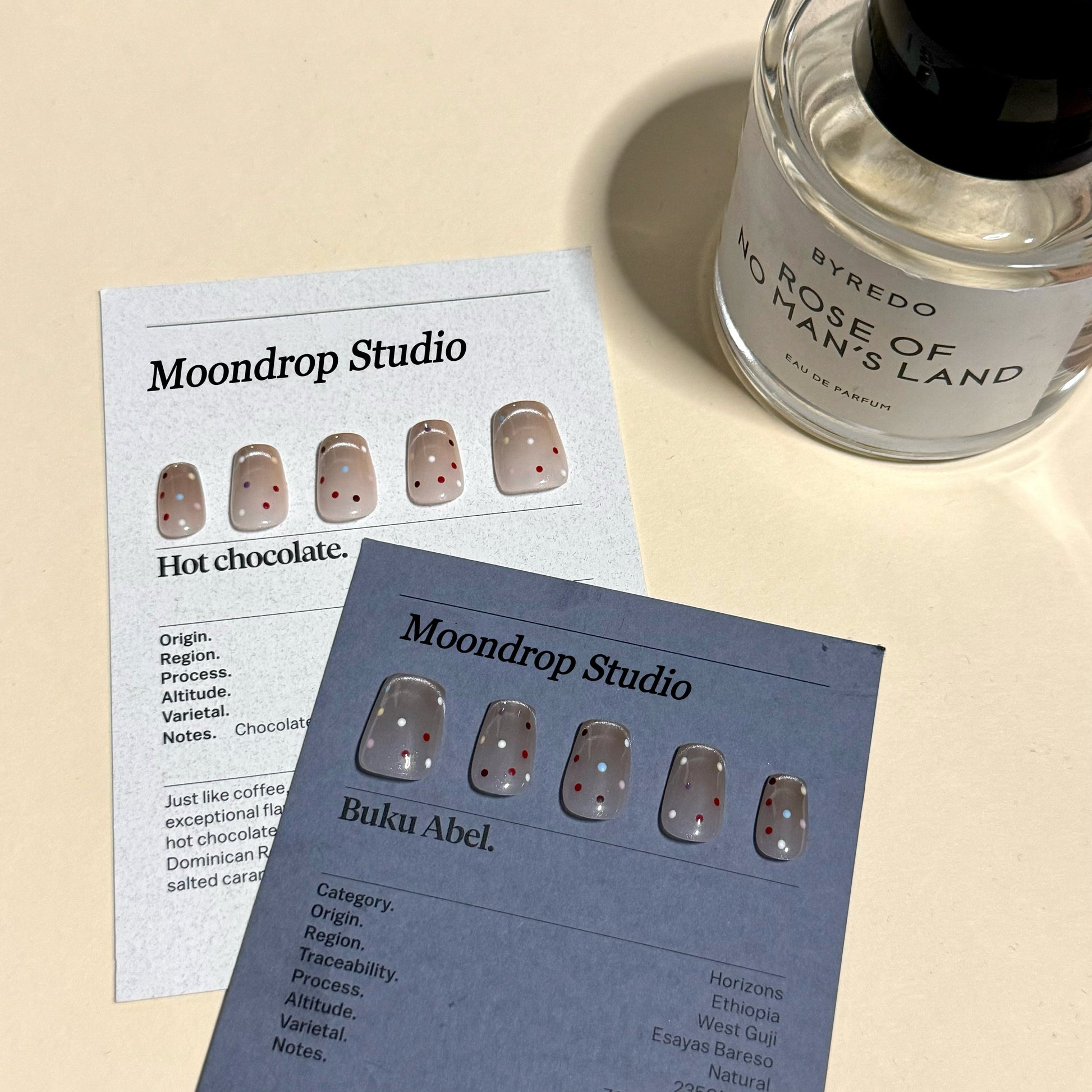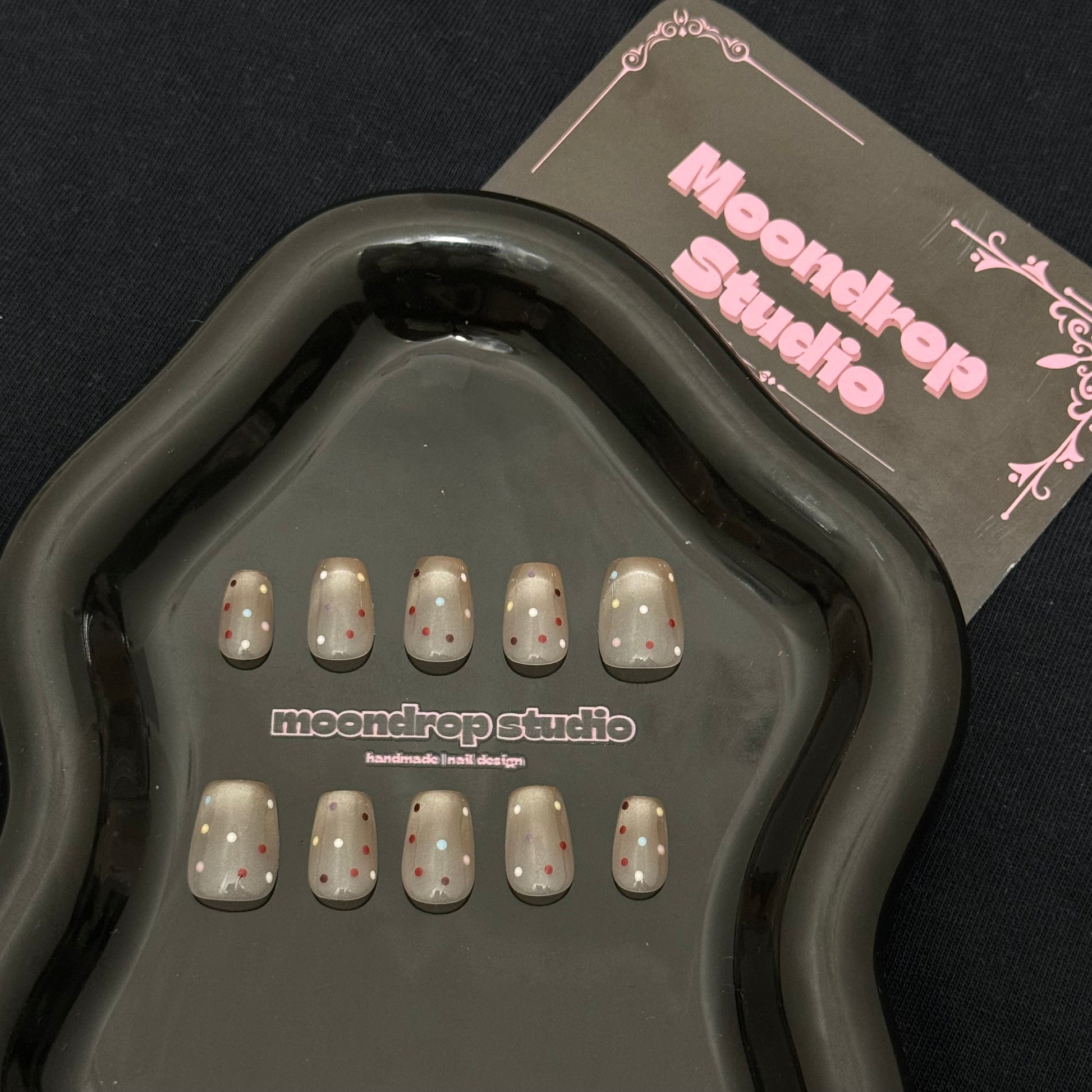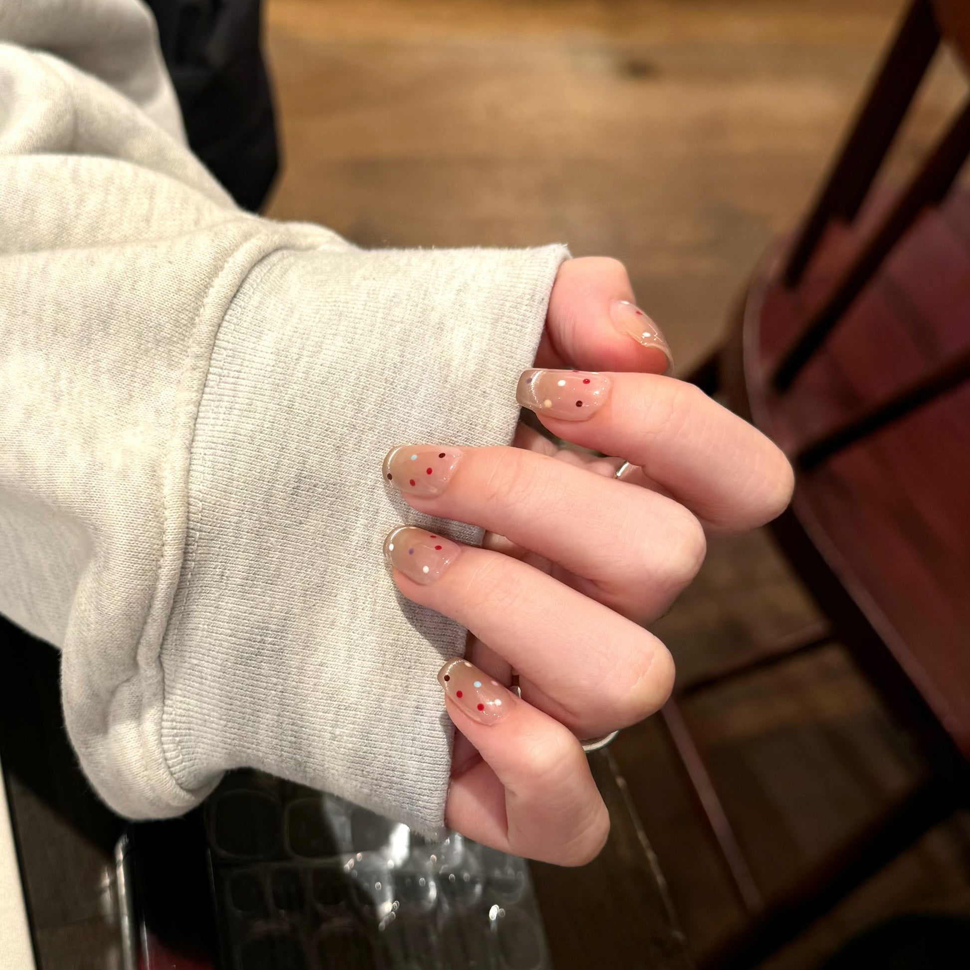 Soft, translucent pinkish-nude base.Decorated with small multicolored dots in red, green, black, and white.The design gives a festive, playful, and minimalist vibe.Similar sheer nude-pink base.Features the same scattered polka dot pattern in red, green, black, and white.The dots contrast subtly against the soft shimmer of the nails, giving it a chic yet fun look.