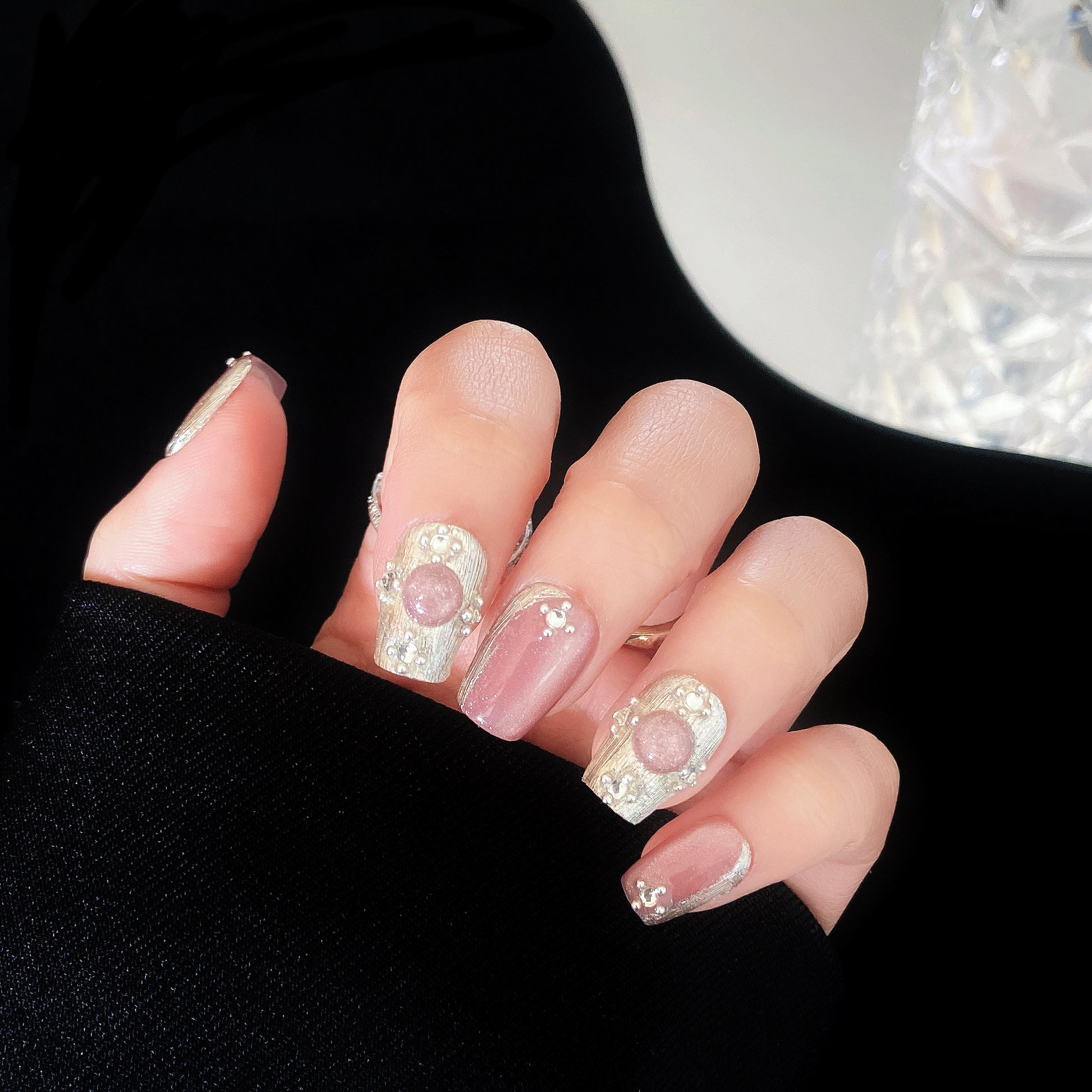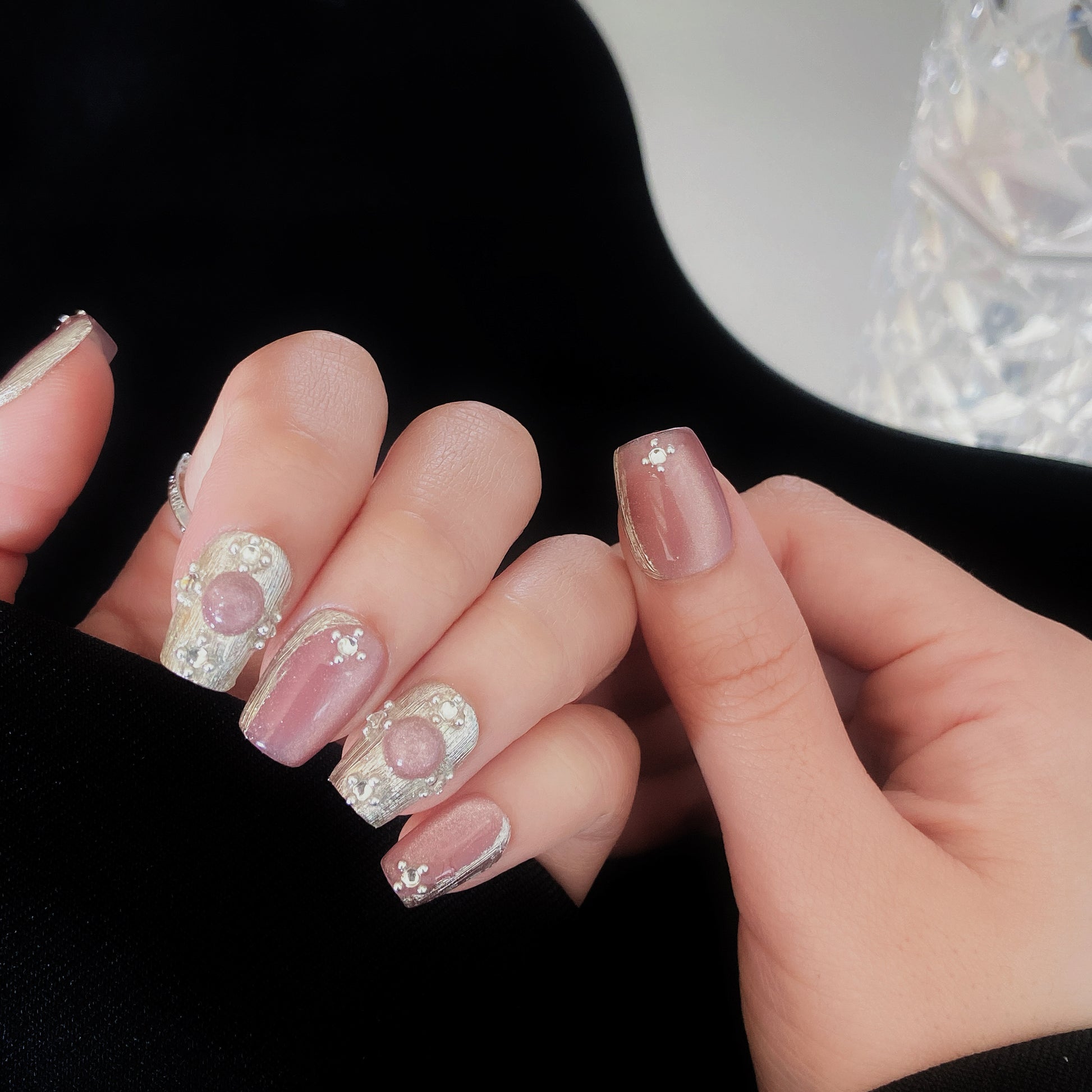 A harmonious blend of soft mauve-pink and metallic silver. Some nails have a smooth, glossy mauve-pink finish with a subtle shimmer. Others feature chunky metallic silver foil for a striking contrast. Several nails are adorned with small pearls and embedded glitter, adding a luxurious and delicate touch.