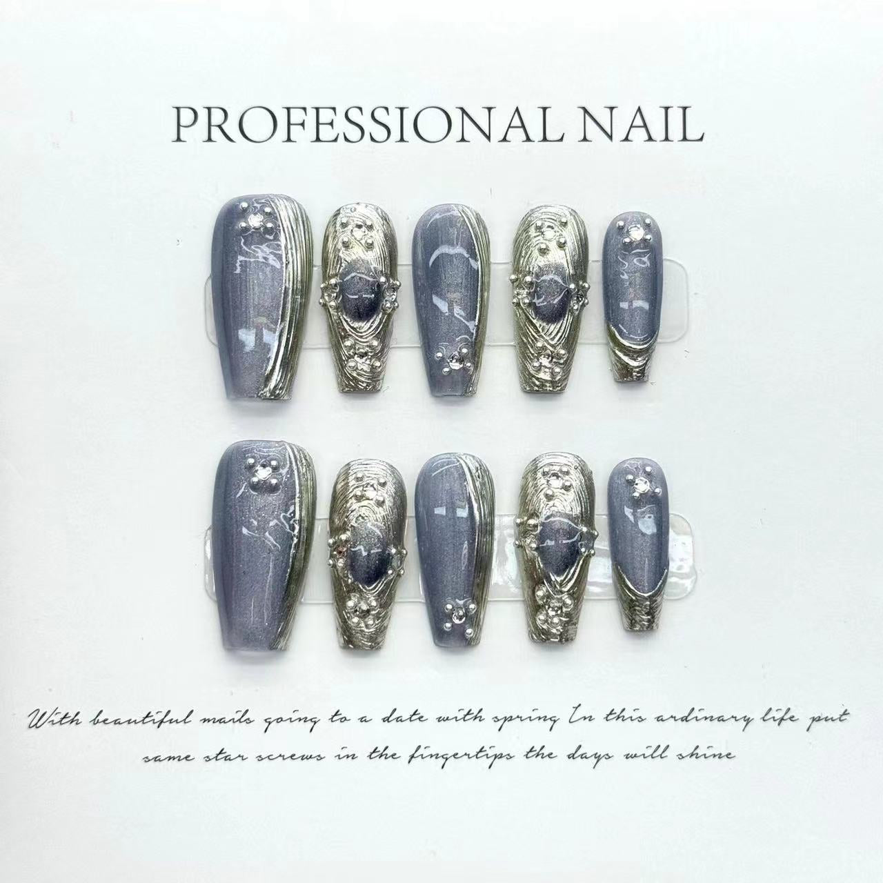 These nails feature a stunning and elegant design. The base color is a smoky, metallic grey with a shimmery finish. Some nails are adorned with intricate silver 3D embellishments that resemble flowing molten metal, giving a luxurious, textured look. Others have minimalistic silver accents and tiny pearl-like beads, adding a touch of sparkle and sophistication. The combination of smooth shimmer and raised metallic designs creates a very dynamic, high-fashion appearance.