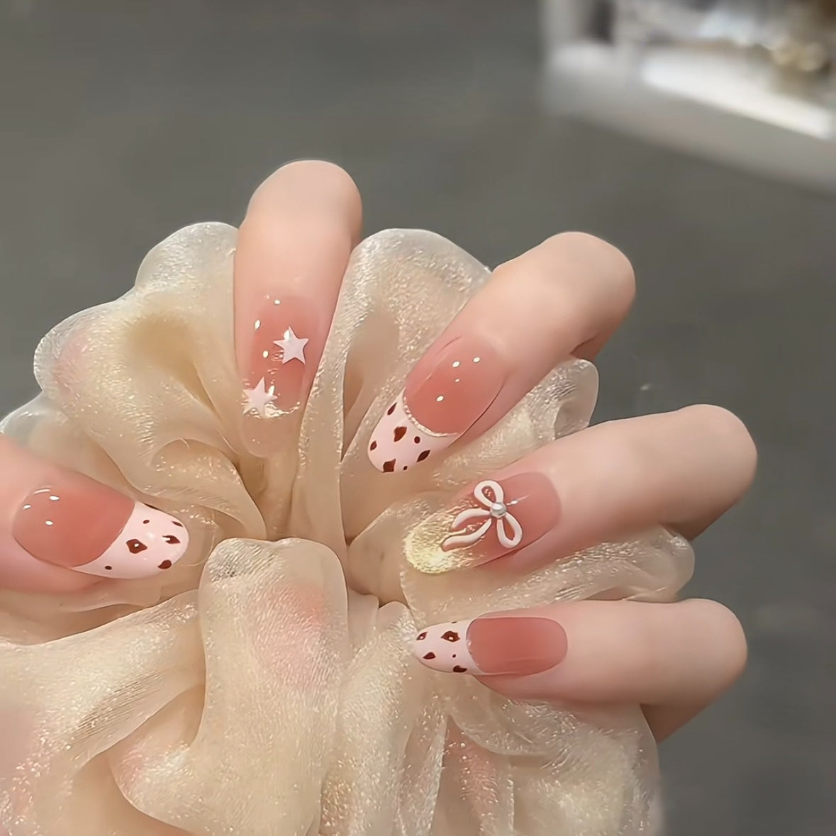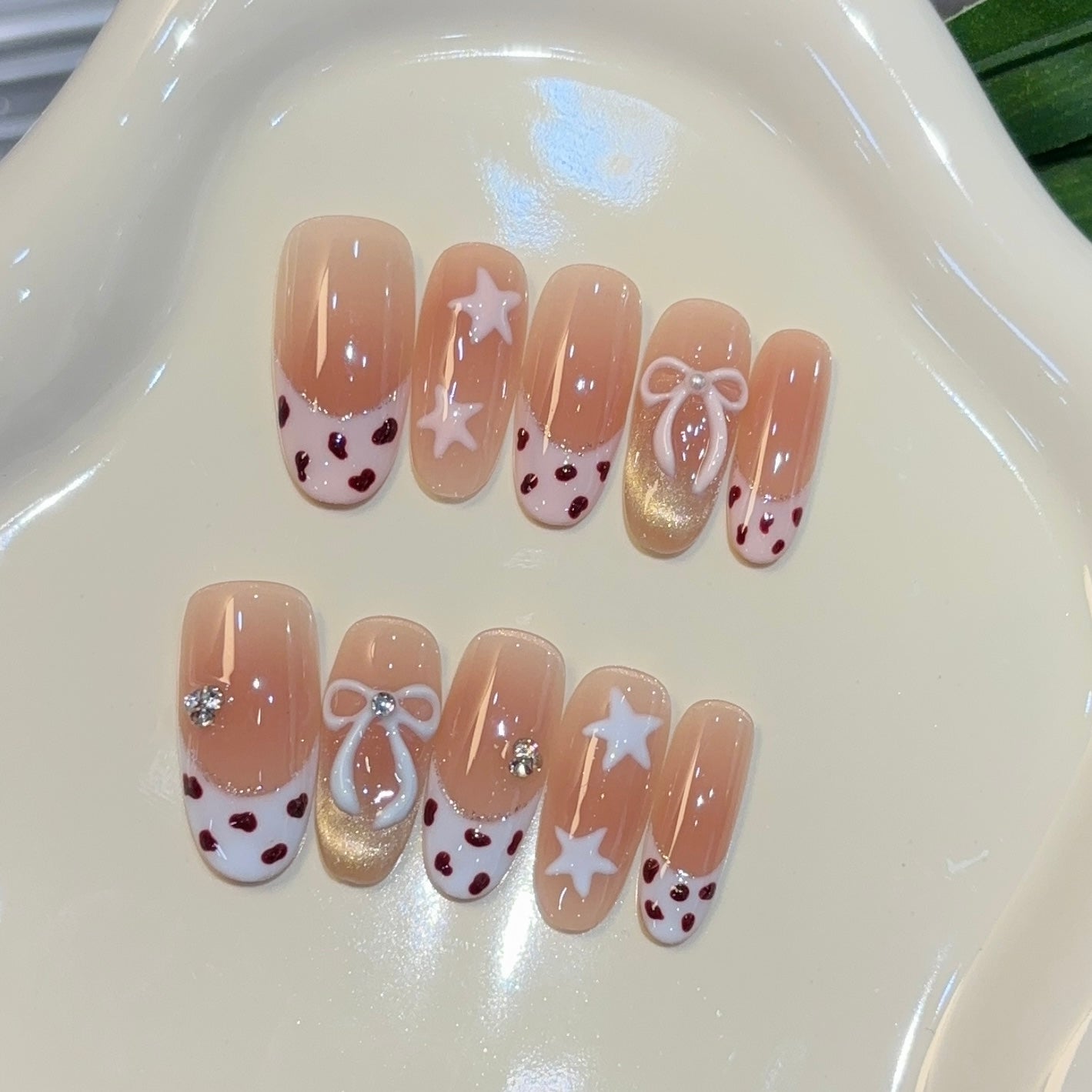 Some nails have white French tips with tiny red heart designs scattered across the tips. Some nails have white 3D stars or 3D bows as decoration.One nail on each hand has a gold chrome effect, which adds a shiny, luxurious touch.Small rhinestones are added to a couple of nails for extra sparkle.
