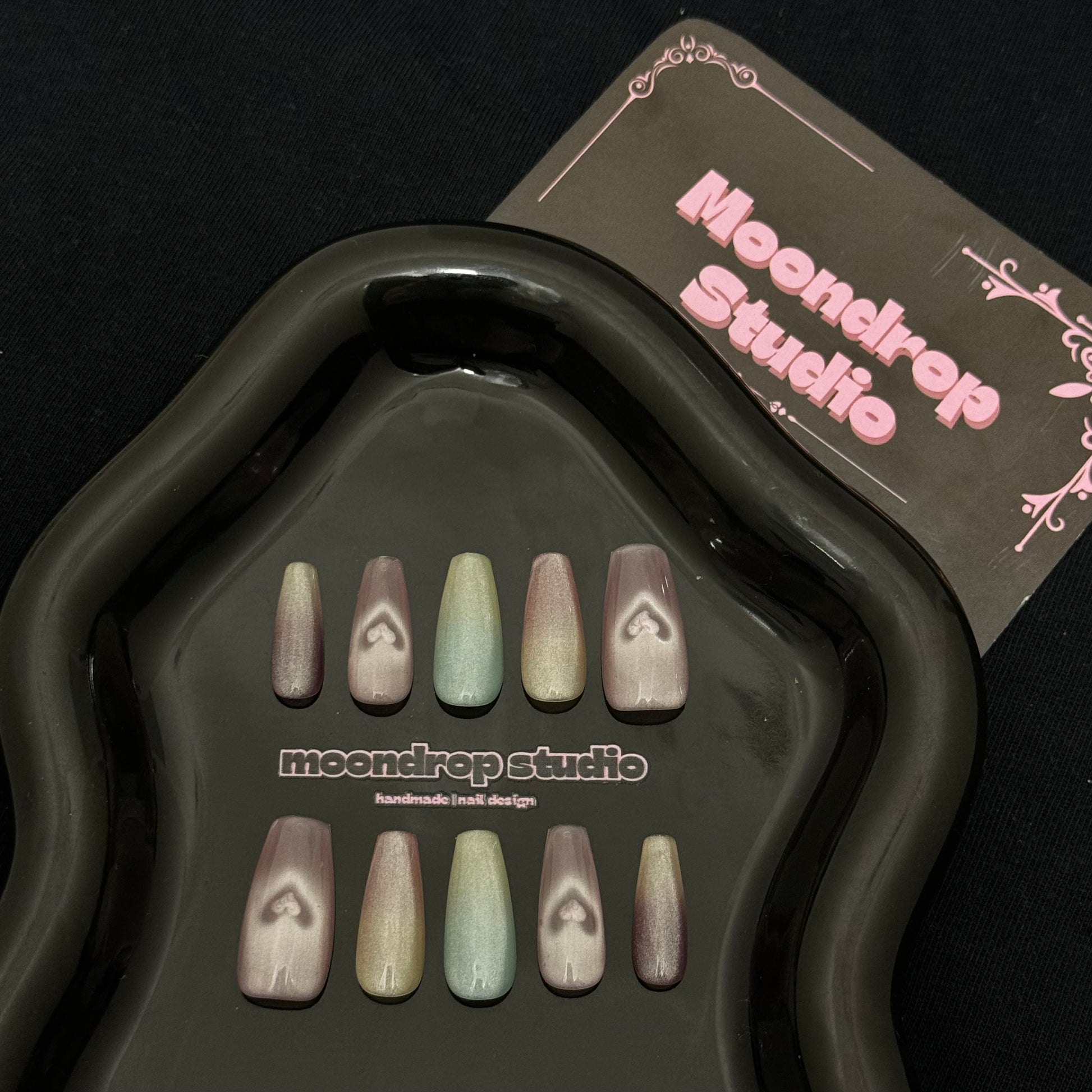 Features a mix of soft pastel colors, including pink, lavender, green, and yellow, with a delicate gradient effect.Some nails are adorned with subtle white heart designs.The shimmering finish gives the set an ethereal, dreamy feel.The overall vibe is soft, dreamy, and iridescent, making these nail sets perfect for a chic, whimsical look.