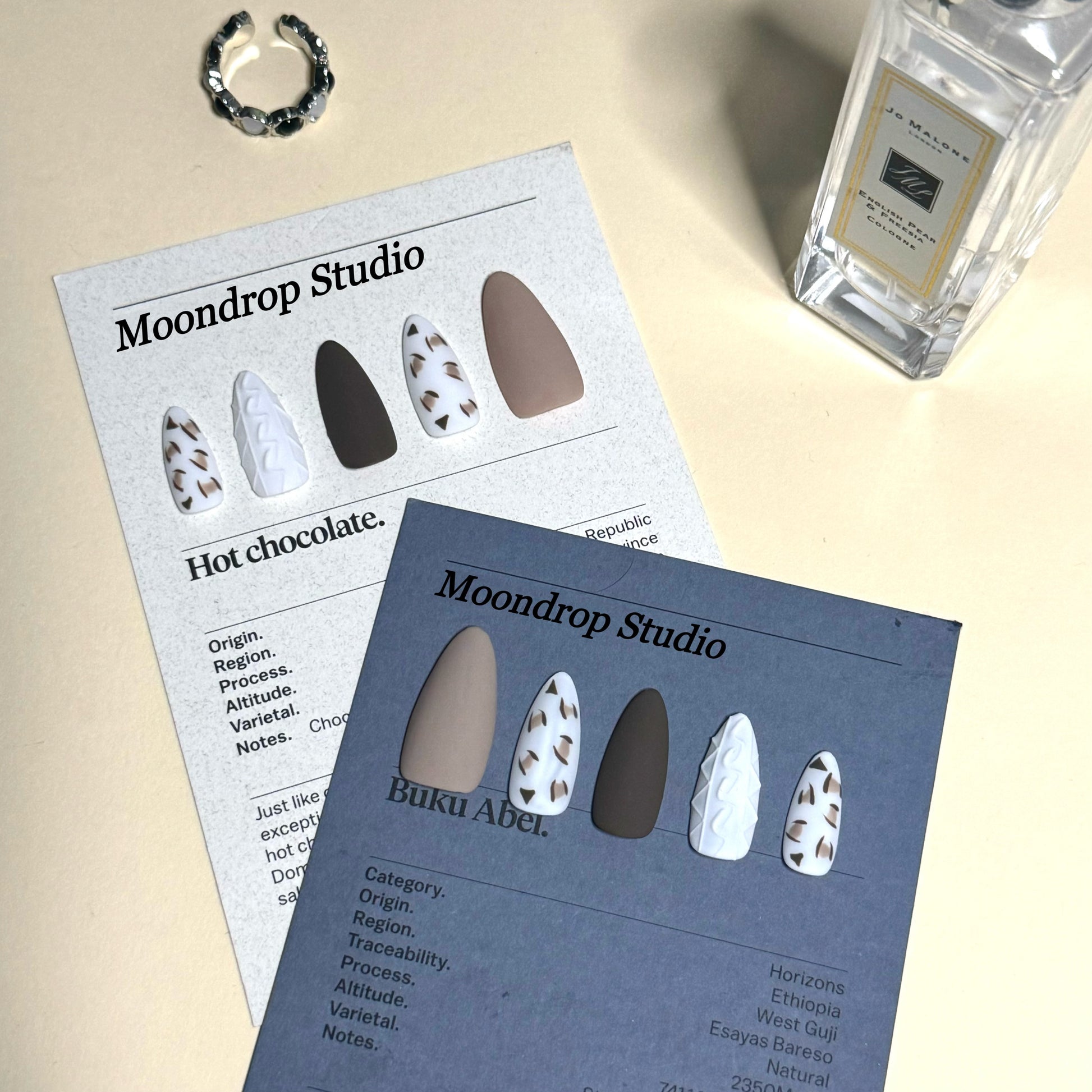 The nails in this image have a bold and modern look. These features long, almond-shaped nails with a creamy white base. The design incorporates abstract, brown swirls or patterns scattered across the white surface, giving it a creative, earthy feel. They also showcases a chic matte brown and taupe color palette, with one nail featuring a textured white design with wavy lines, adding dimension and interest. These sets are sleek and stylish with contemporary, artistic designs.