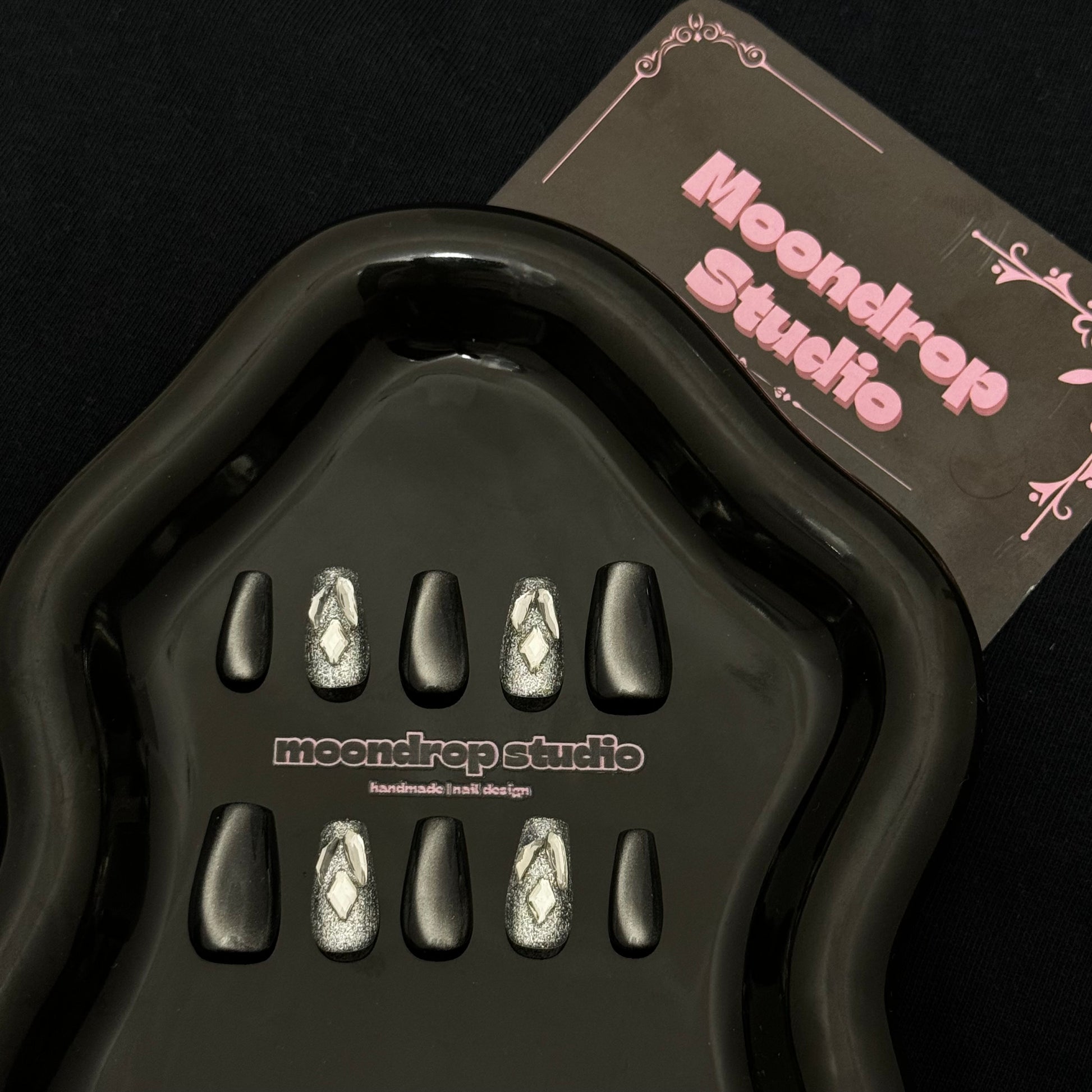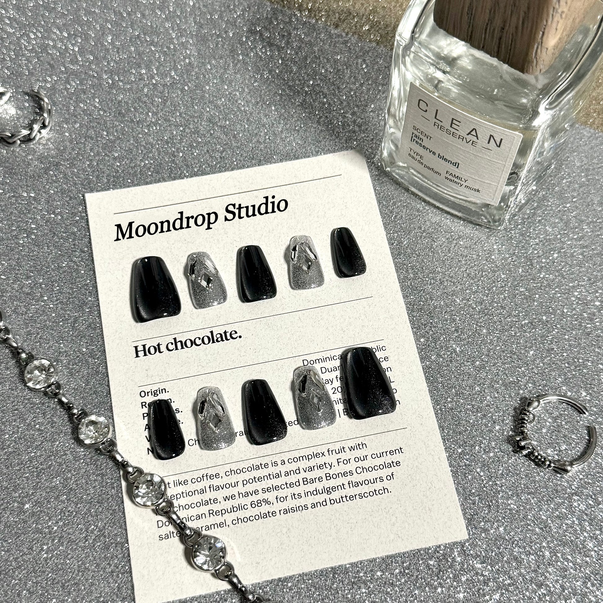 Glossy black nails paired with sparkling silver glitter create a bold, edgy contrast. Accented with clear gem-like details, the design offers a refined, luxurious vibe. This chic, modern set blends solid black, glitter, and gems, making it versatile for elegant or evening wear, perfect for dark, dramatic styles with a hint of sparkle.
