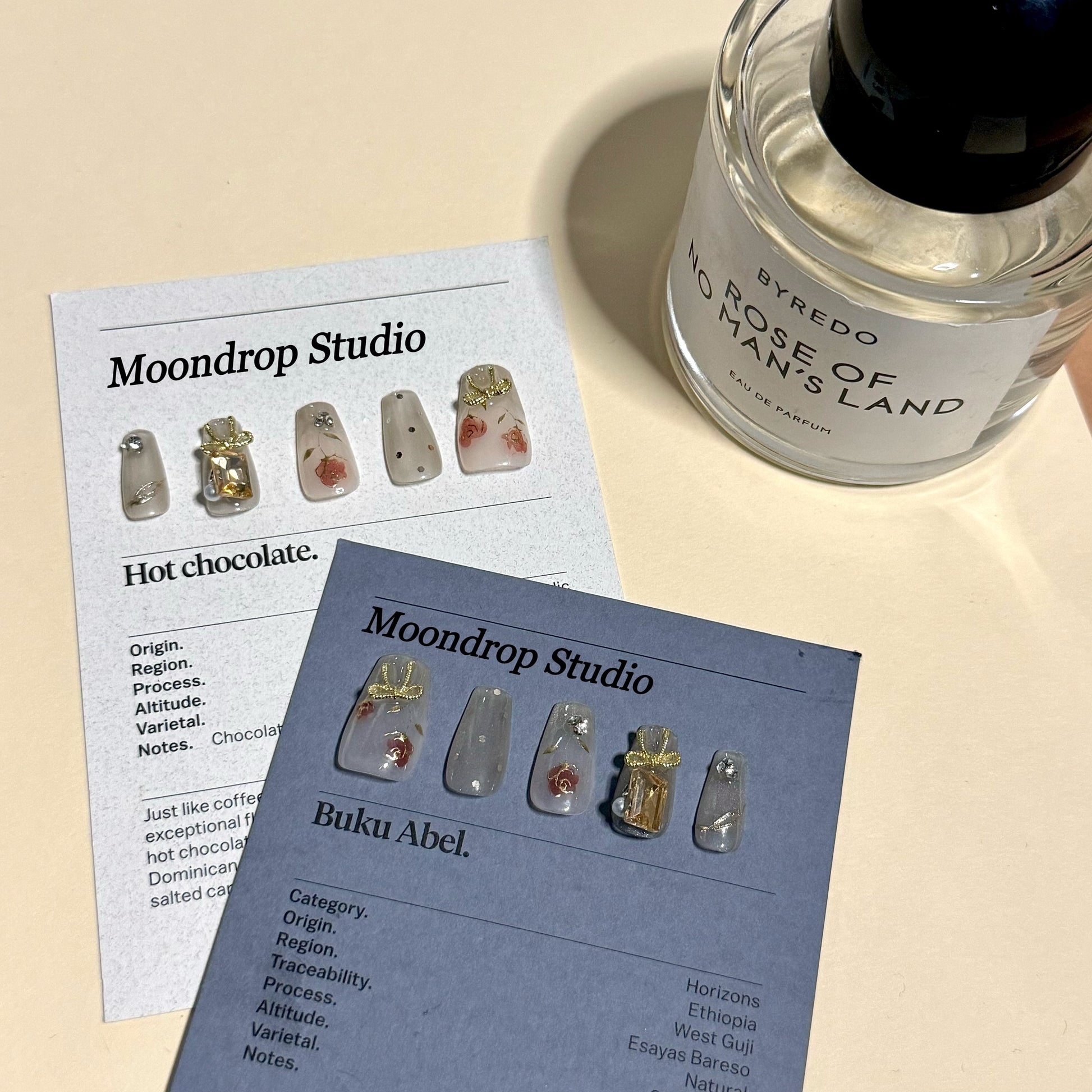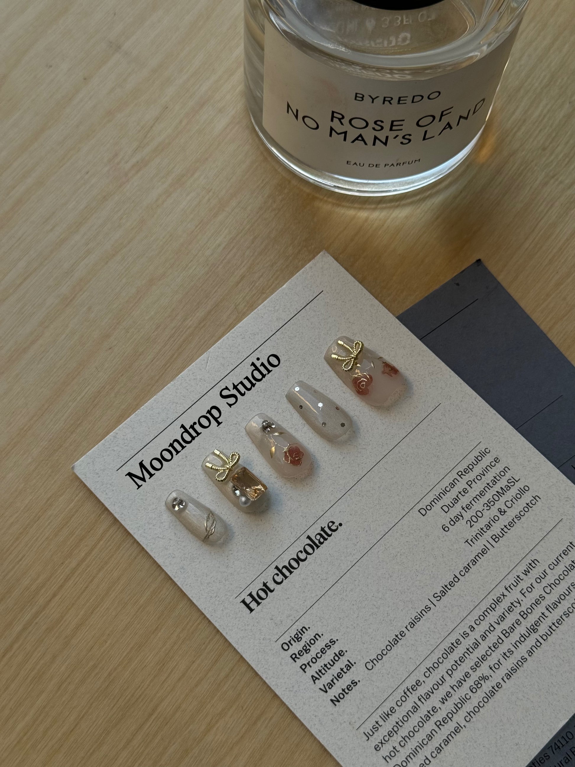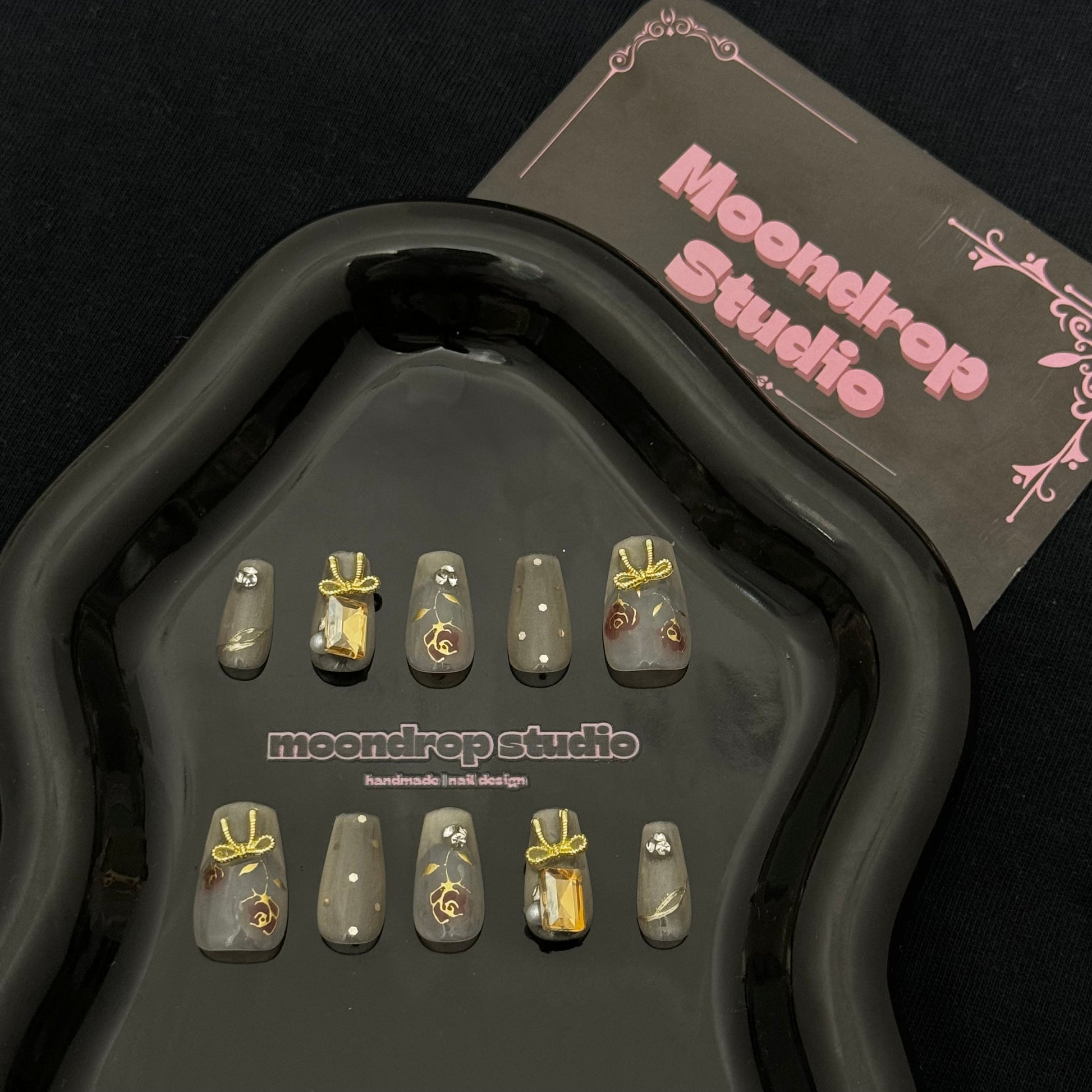 Delicate hand-painted rose designs in a muted red hue.Gold embellishments, including 3D charms shaped like bows and gem-like accents.Minimalist rose details for a refined touch.This design blends romantic and vintage-inspired elements with modern elegance, creating a sophisticated yet feminine aesthetic.