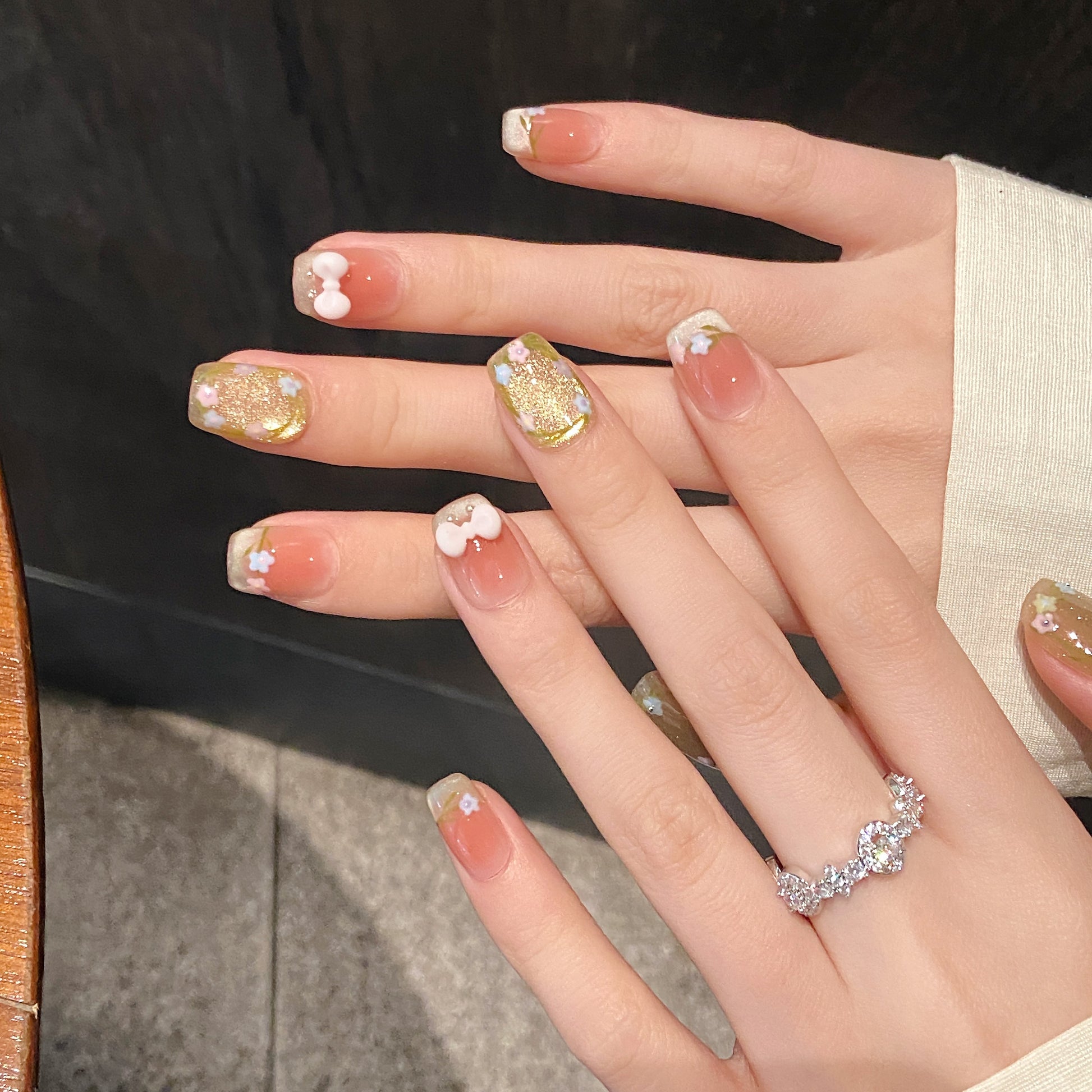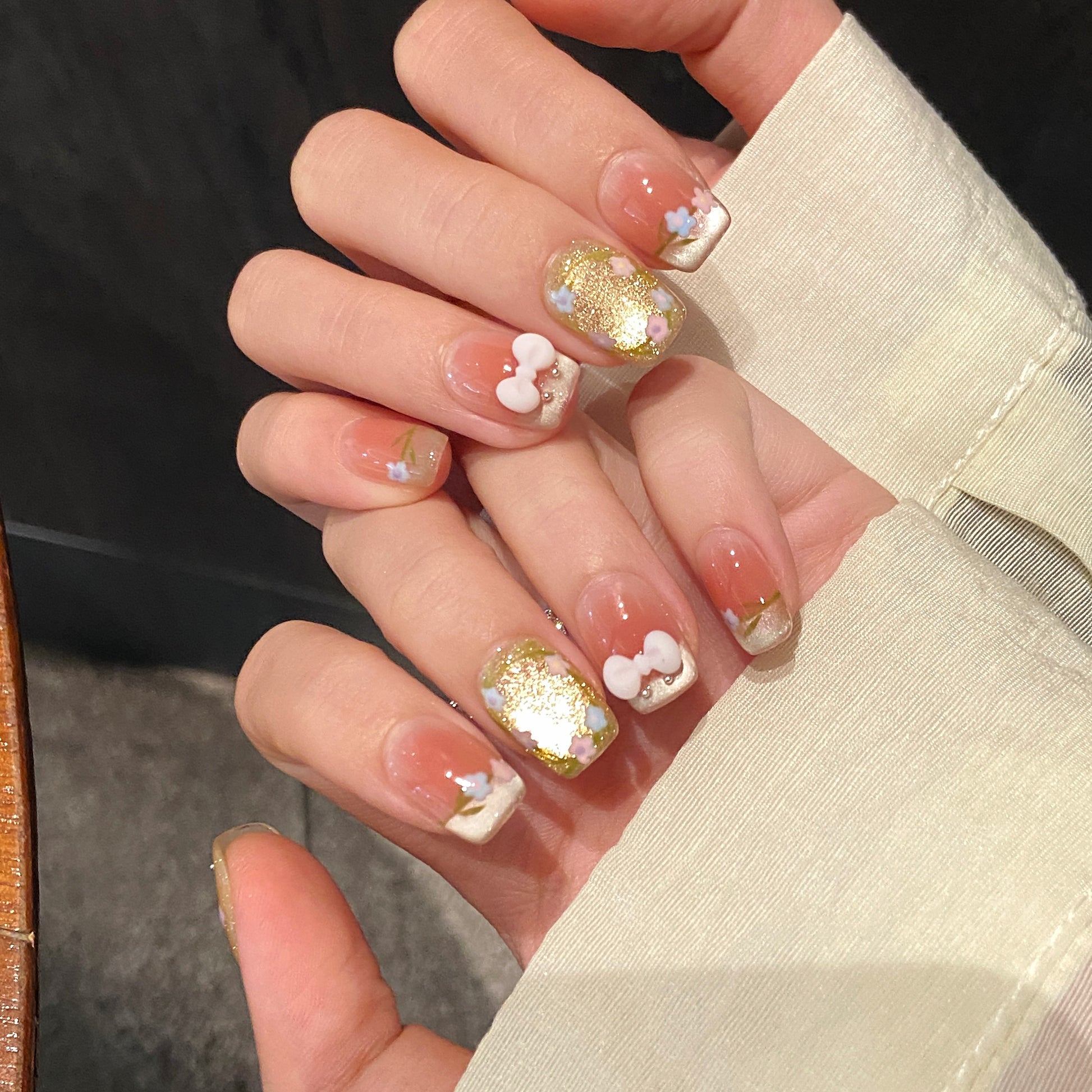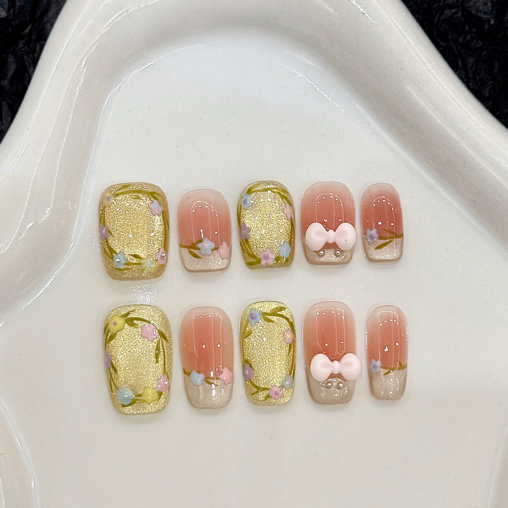 Some nails are fully covered in a gold glittery base with pastel flowers (pink, blue, and purple) and green vines painted delicately around the edges.Other nails have a pink ombrè effect fading into a neutral tip, also decorated with tiny pastel flowers.Two nails feature 3D pastel bows (one white and one pale pink), placed at the base of the nails with little pearl details underneath.