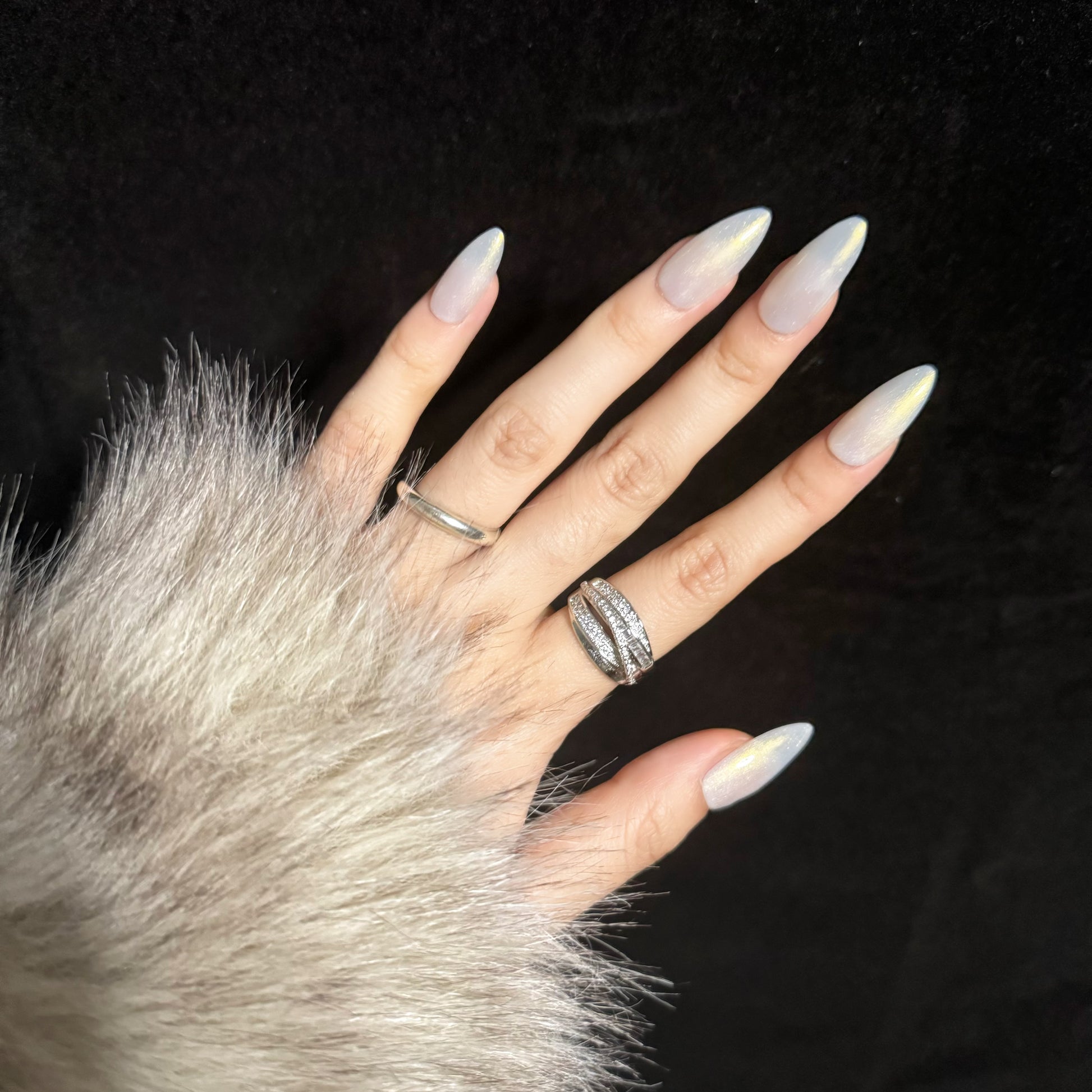 The base color might be a soft, neutral tone such as beige or light pink, providing a clean and subtle background. Accents of metallic gold or silver could be used to create intricate designs, such as geometric shapes, lines, or floral patterns, adding a touch of glamour and sophistication. The overall design is likely to be balanced and harmonious, making it suitable for both casual and formal occasions. This manicure reflects a modern and trendy aesthetic, showcasing attention to detail and a high level of craftsmanship.