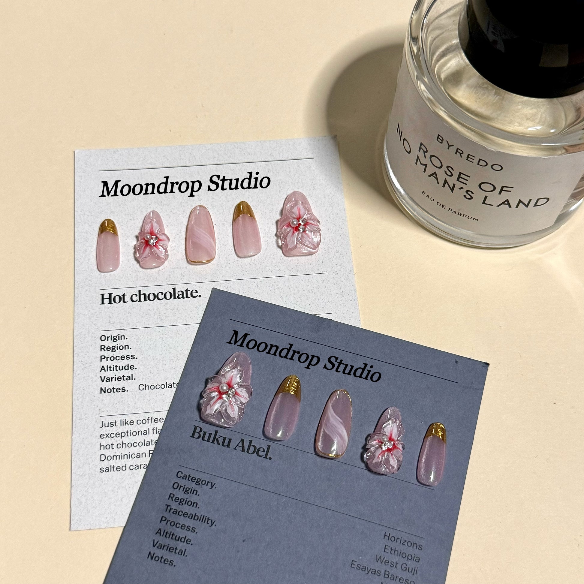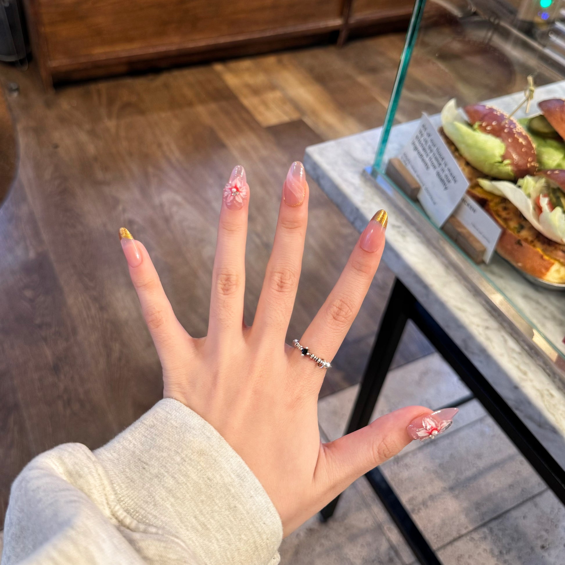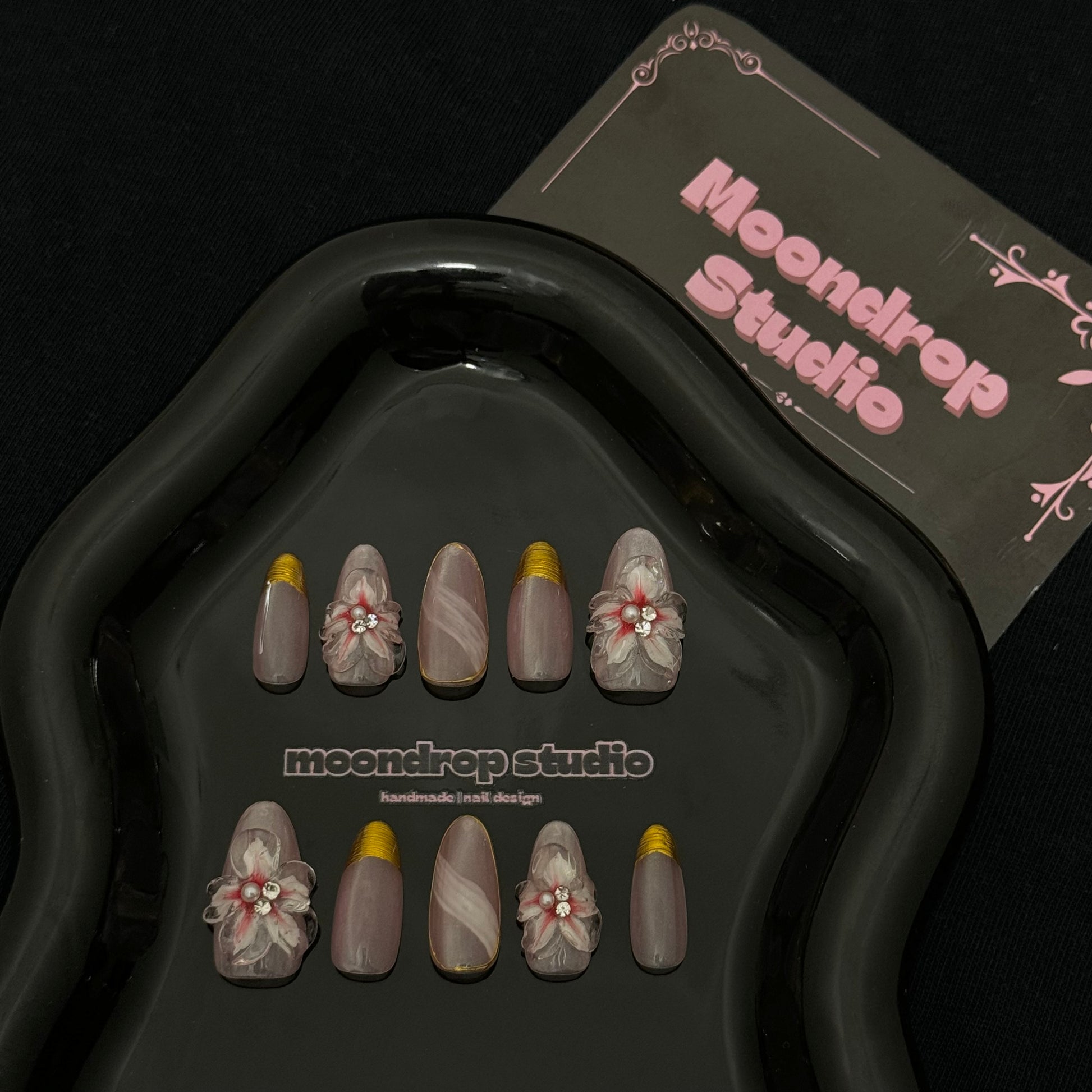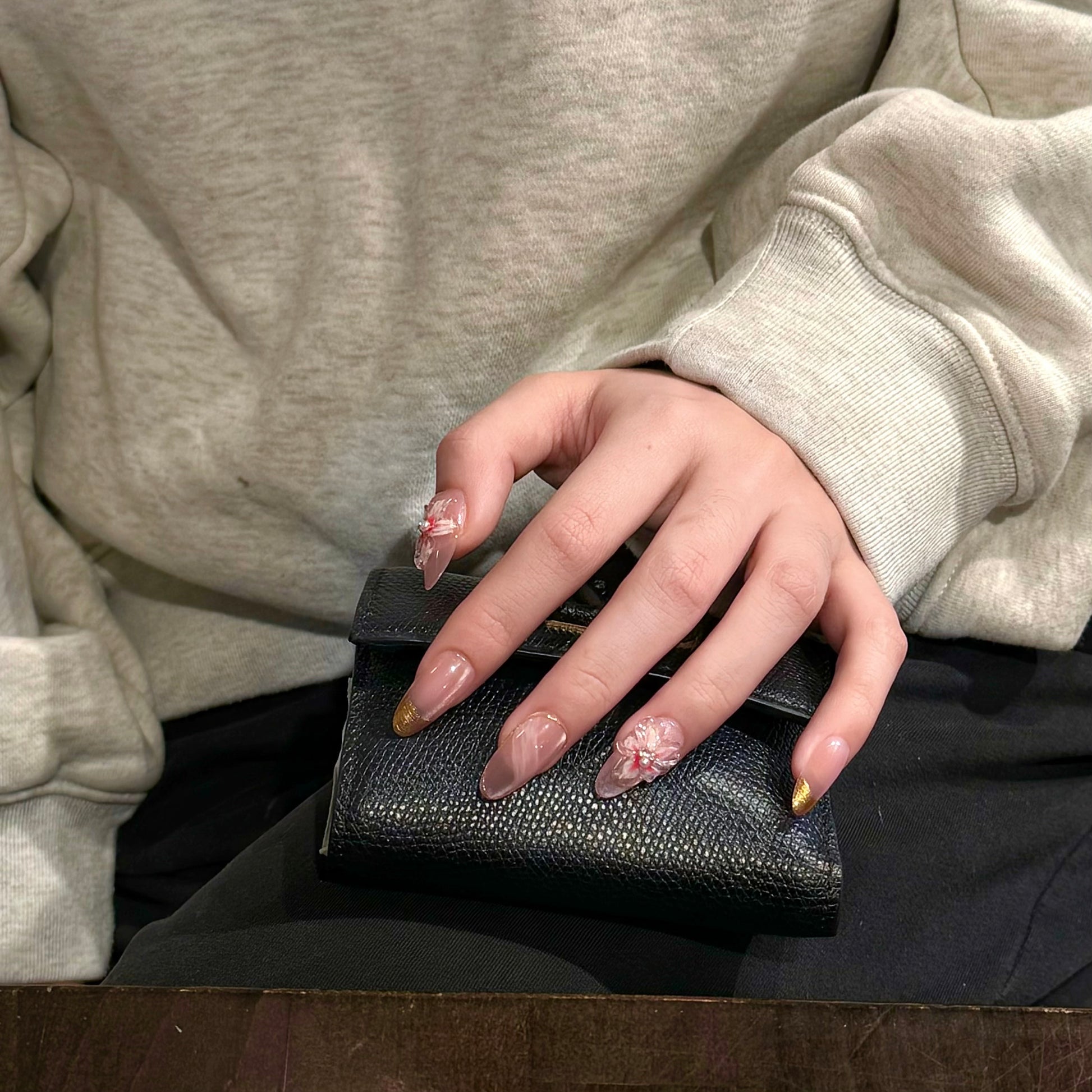 A soft pink base with marbled swirls on some nails, paired with gold French tips for a luxurious touch. Adorned with 3D floral embellishments featuring pink and white flowers and tiny gemstones, this set exudes an elegant, feminine aesthetic blending soft hues, gold accents, and intricate floral details.