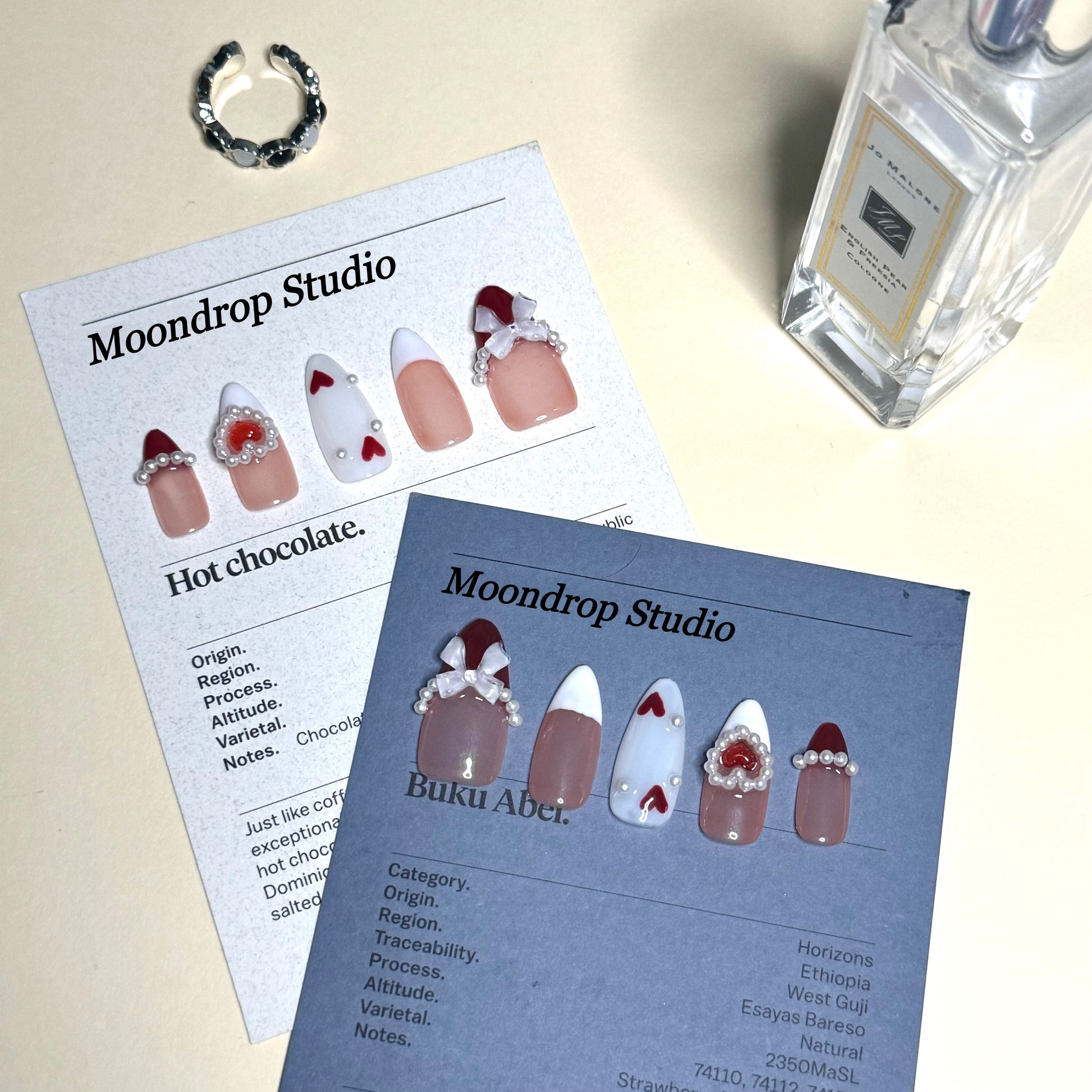 The nails in this image feature elegant, feminine designs with a combination of light pink or nude bases and white tips. Some nails have added decorative elements like pearls, bows, and heart motifs, creating a chic, romantic look. The nails with white tips have a sharp, angular shape, and the pearl details along the cuticles add a luxurious touch. The designs on these nails have a more refined, classic feel, with a focus on delicate adornments and soft color contrasts.