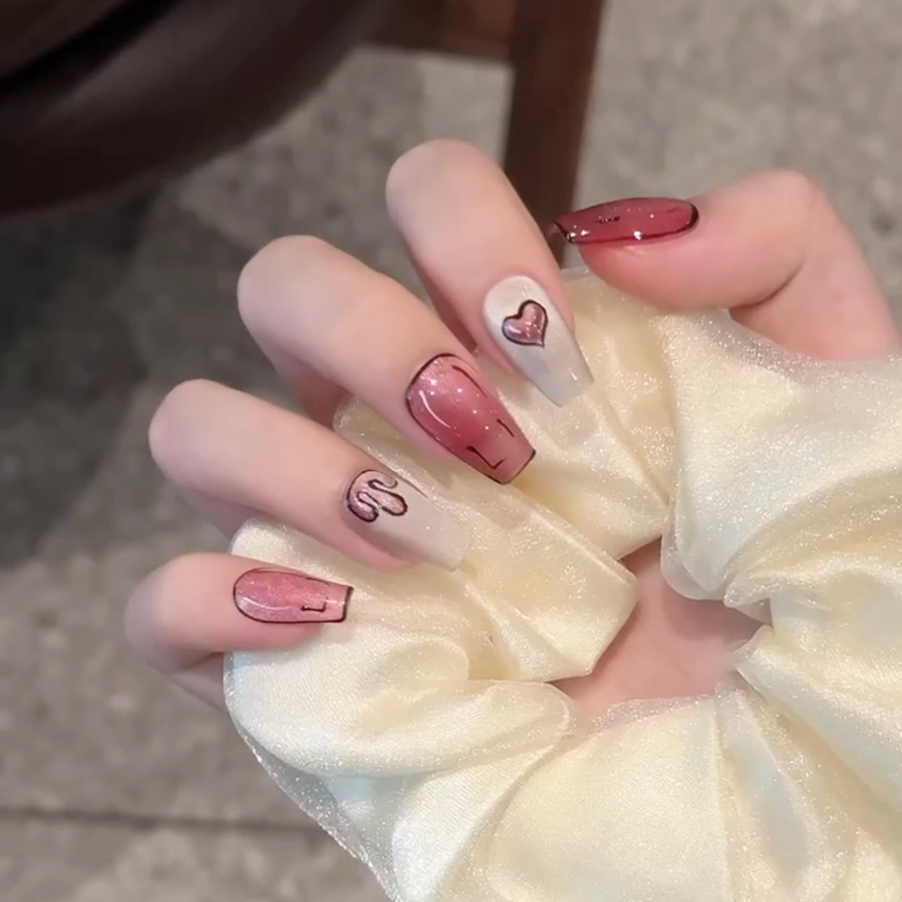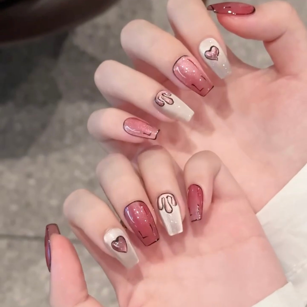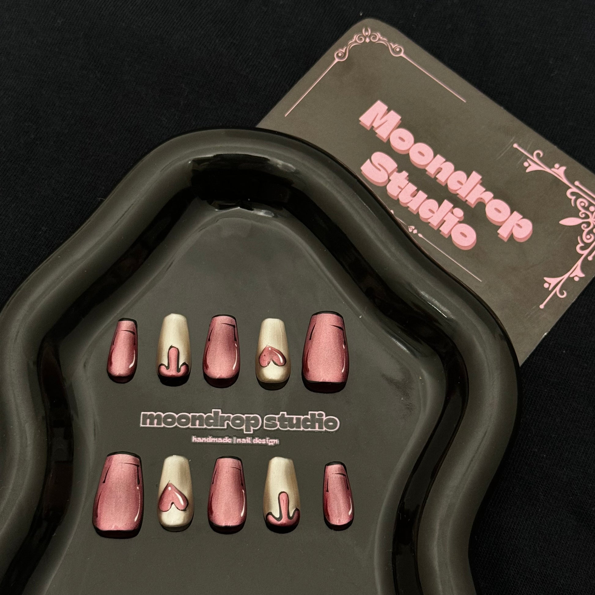The rose pink nails are sleek and shiny with minimalistic black line details near the top edges, giving a clean, outlined effect. The champagne gold nails feature adorable rose pink designs — two nails have a heart shape, and two have a dripping paint effect, making them stand out in a playful and romantic way.